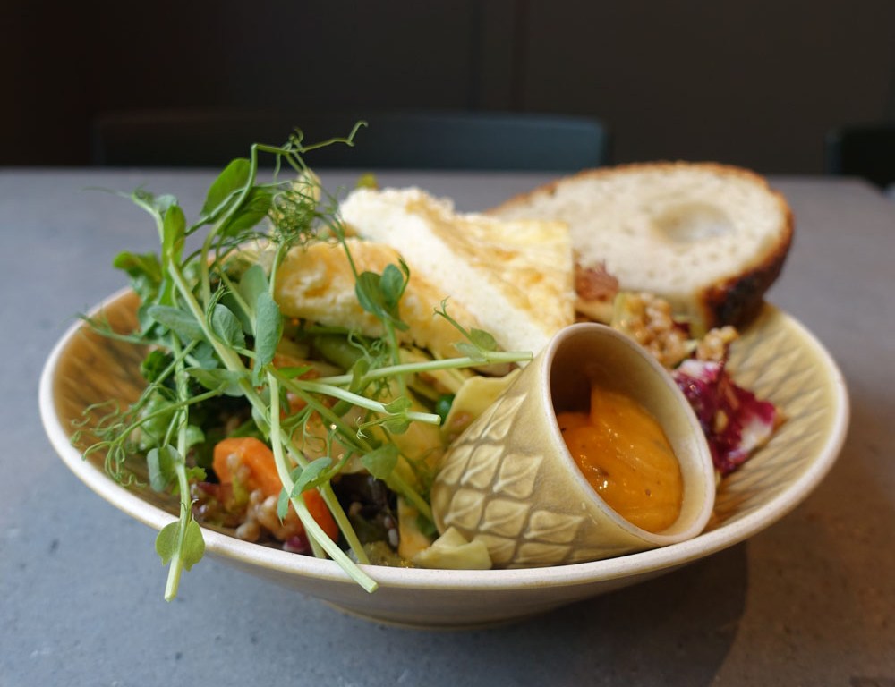 Porslinet är en av de saker som vi får mest beröm för. Här ser ni Jens Harald Quistgaards stengodsserie Relief, som jag och Ante köpte på auktion i Köpenhamn i vintras, innan vi ens var säkra på att vi fick ett hyreskontrakt. Den här servisen har fått sätta tonen för hela inredningen och stämningen. Här fylld med den sallad som utan tvekan ligger etta på lunchtoppen just nu. Som grund använder vi alltid något slags helt ekologiskt korn från Limabacka Kvarn eller Berte Qvarn. Råg, vete, emmer, dinkel, nakenkorn eller nakenhavre. Sedan en massa krispiga grönsaker, en god dressing och kyckling eller omelett som tillbehör. Det märks verkligen att folk i den här stan har längtat efter ett lunchalternativ åt det hälsosamma hållet och det kommer vi att fortsätta ge dem.
