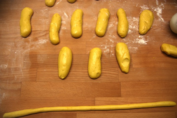 Dela degen i bitar om 60 g. Rulla till runda bullar och forma sedan till små korvar, som får ligga och slappna av på bakbordet under en duk. När de har vilat ca 15 minuter blir det mycket lättare att rulla ut dem till långa strängar som du sedan formar efter tycke och smak. Tryck ner russin i mitten på snirklarna. Strängarna ska vara riktigt långa för att formerna verkligen ska synas efter jäsning och gräddning. Lägg bullarna på en plåt med bakplåtspapper, inte för tätt. De ska jäsa till dubbel storlek, tar cirka en timme beroende på hur varmt det är i rummet. Låt dem gärna stå och jäsa i ett slutet rum, typ ett skåp för att undvika drag. De får allra bäst volym om man undviker att ytan torkar under jäsningen.