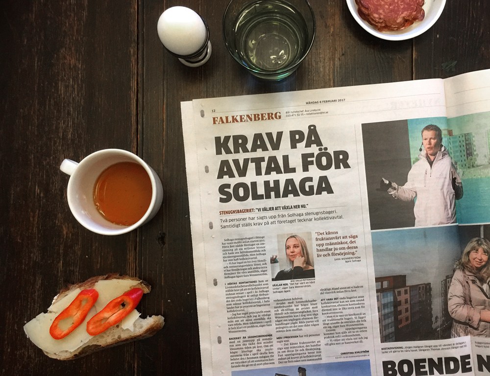 Till frukost idag kunde man läsa i Hallands Nyheter om Solhaga Stenugnsbageri. Det står att vi sagt upp två personer, och att fackförbundet Livs vill att vi tecknar kollektivavtal från den 1 april. Jag tänkte berätta lite för er om vad som har hänt.