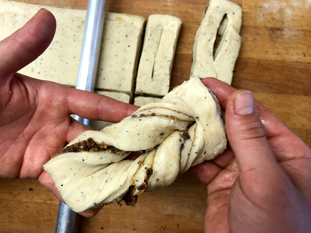 Platta ut degen och låt den vila i kylen i 30 minuter. Detta gör att degen spänner av och går lättare att kavla. Kavla ut varje degbit till en platta som blir cirka 40 cm bred. Bred på generöst med fyllning och browniesmul och vik ett treslag – degen ska bilda tre lager. Dela remsan en gång på längden. Skär sedan i bitar, 60–80 gram styck. Skär ett snitt i mitten på varje bit.