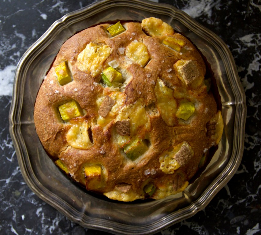 Här ska ni få receptet på det bröd som sålde slut snabbast igår – en formidabel succé faktiskt. Såhär i den finaste av skördetider finns det ingen anledning att stoppa oliver i focaccian, som originaltraditionen bjuder. Kommer ni ihåg vår midsommarvariant med färskpotatis och gräslök?