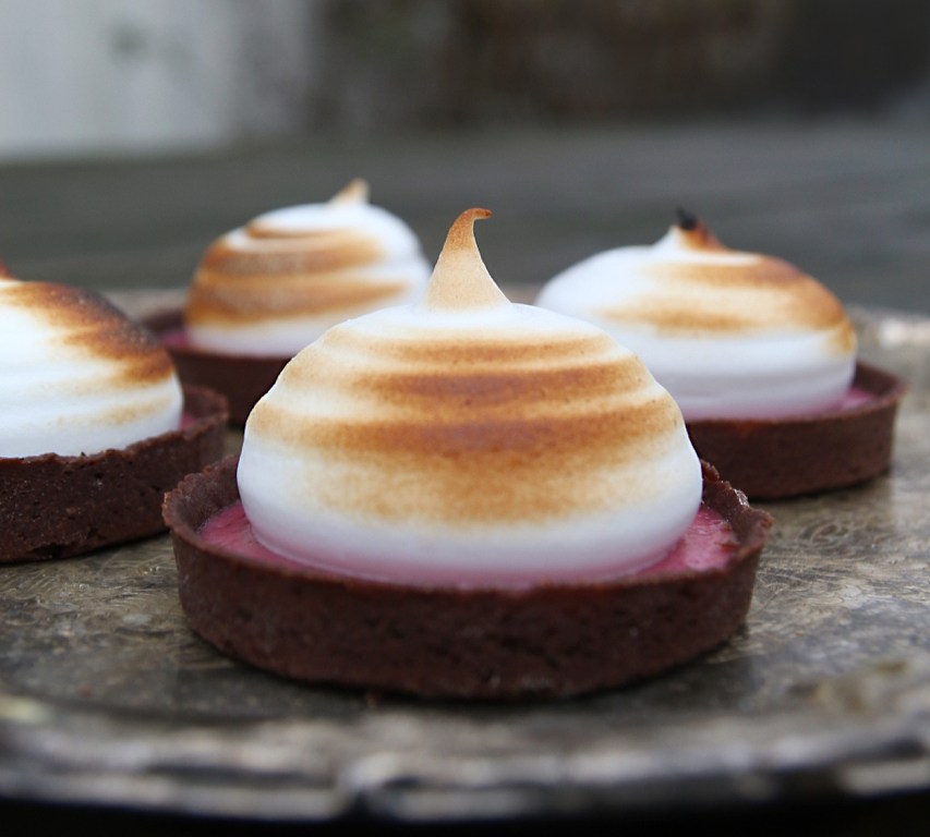 Jag är fortfarande hemma krasslig efter nyår, men nu börjar jag bli riktigt rastlös. Smög mig ut i stora frysen nu på morgonen för att hämta hem den finaste förmiddagsfikan. Här har ni årets vinterdessert på Solhaga. Jag älskar kombinationen av det spröda chokladskalet, syrlig curd och söt krämig maräng på toppen. Du kan antingen göra en större paj, eller 10–20 mindre. Tarterna går fint att frysa in när du spritsat på marängen. Sedan kan du låta dem tina, och därefter ge dem sista färgen med gasbrännaren. Perfekt om du vill förbereda dessert i god tid till något festligt tillfälle.