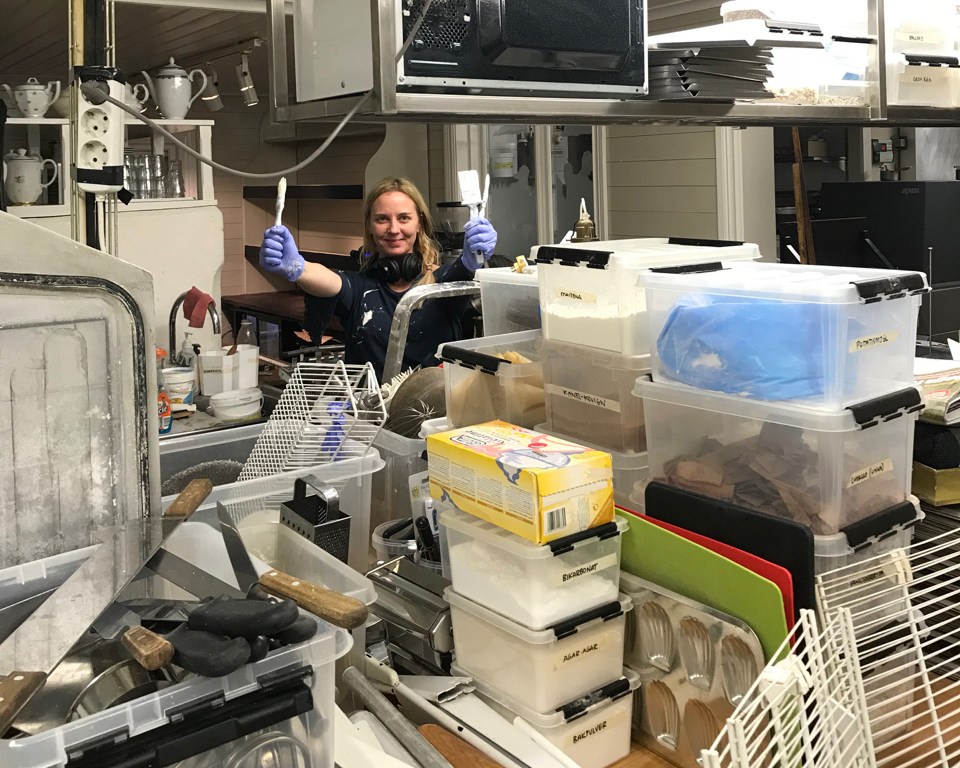 Det är onsdag kväll, och vi har just avslutat den femte och sista dagen av Solhagas totalrenovering. Istället för den vanliga doften av bröd och bullar är det lukten av linoljefärg som dominerar. Rosa målar väggarna med Ottossons linoljefärg i vår specialkulör 2005-Y30R medan jag tar hand om griffeltavlefärgen till brödhyllan.