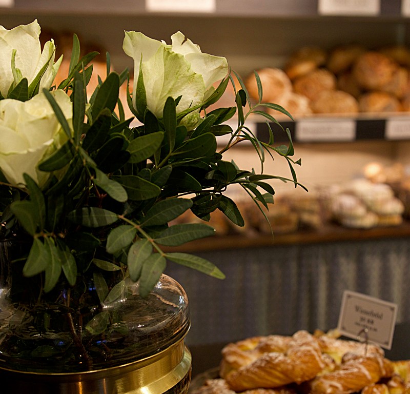 Med tiden är det oundvikligt. Alla platser där människor rör sig slits och förändras. Under de sju år som gått sedan vi öppnade har många medarbetare kommit och gått. Som fått idéer och genomfört dem, och med tiden gjort butik och bageri till ett lapptäcke som inte alltid hänger ihop. När jag tog den här bilden i somras var det med en kärleksfull blick på solen som tittade in genom dörren. Men tar jag på mina inredningsglasögon är jag inte lika förlåtande. Vad gör den illgula skylten i fönstret? Ramarna hänger snett och golvlisterna är smutsiga. Reklamlapparna på bordet till vänster ger ett rörigt intryck, liksom den tomma knäckebrödskorgen som står snett på den fina kaminen. Glaslyktan på bordet till höger passar egentligen inte i stilen, och förresten var bordet en provisorisk nödlösning som råkade bli kvar. Alltihop spretar.