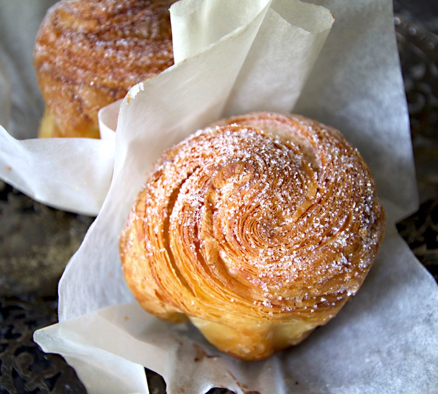 Låt svalna och doppa i socker med en nypa salt i (vi använder vårt kouign-amann-socker, som består av 20 g salt och 1000 g socker).  Ta upp snurran, och hitta en lämplig ingång med spritsen, fyll med rabarberkräm. Jag kan lova att det är värt att lägga ner lite jobb på den här, vilken dundersuccé den blev i butiken.