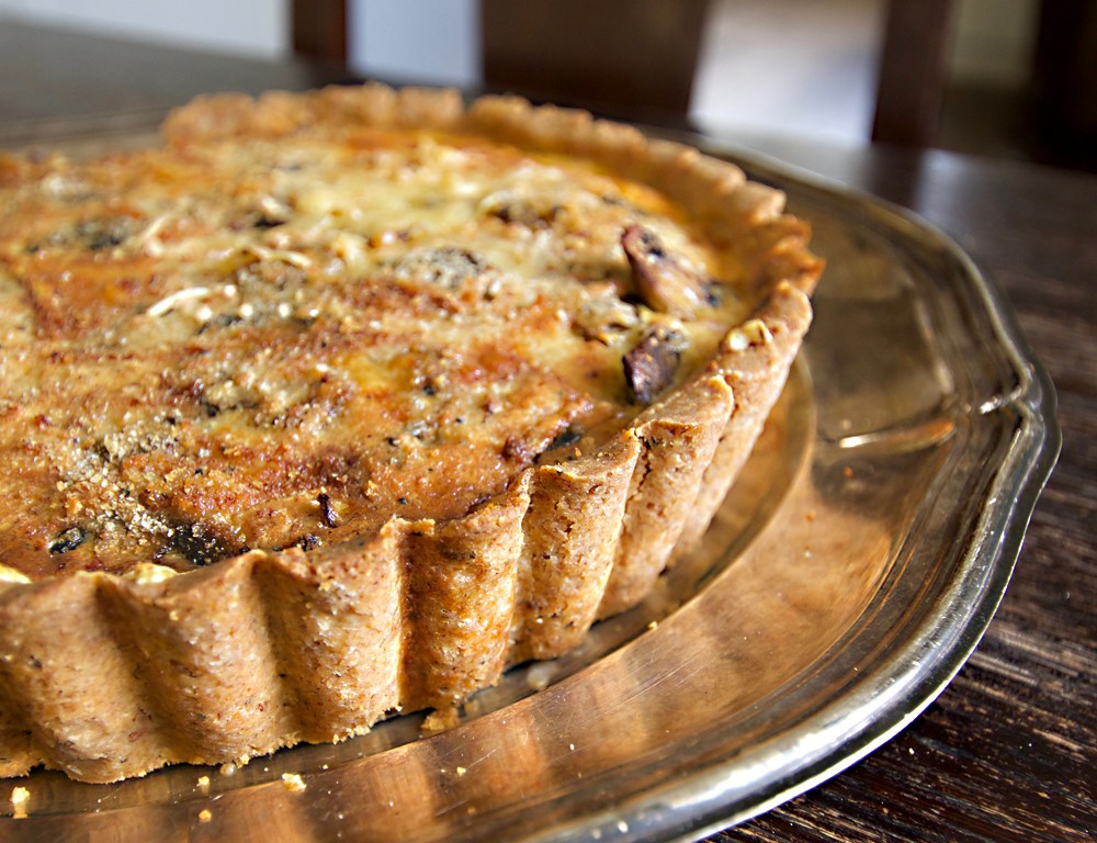 Och ströbrödskvarnen går varm en gång i veckan, då vi maler ner torkade överblivna brödkanter till olika sorters ströbröd. Vi använder det själva på olika sätt, och har även påsar till försäljning i butiken. Fyra sorter har vi – levainströ, lanströ, fröströ och rågströ. Här ska ni få recept på en ny favorit – paj med skal av ströbröd, fylld med allt möjligt som blev över i kylskåpet.