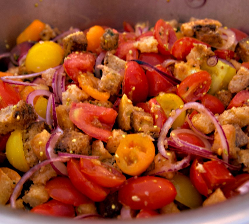Lisa lagade panzanella på gårdagens levain, och jag bakade äppelkakan som jag bloggade om igår. Panzanella är alltså en toscansk brödsallad, och något av det absolut godaste man kan göra av gårdagens bröd.