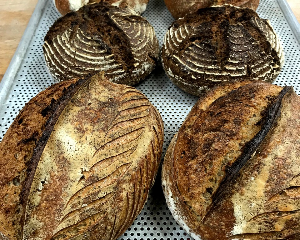 1. Surdegsbröd med vete: Slöingebröd (längst fram i bild). Handknådat och jäst i 48 timmar, med vetemjöl och rostad fullkornsdinkel från Berte Qvarn, och hel emmer från Limabacka Kvarn.
