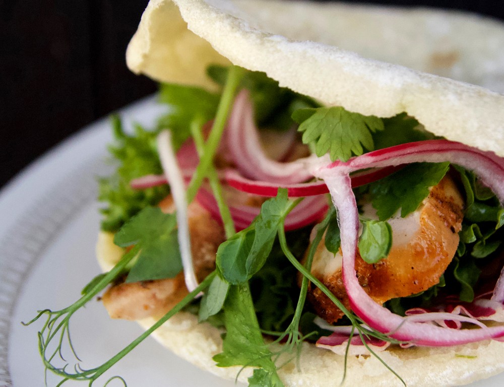 Jag blev väldigt populär när jag bjöd på fredagslunch i bageriet och stoppade i det som vi hade hemma – grillad kyckling, örtmajonnäs, sallad, picklad lök, koriander och ärtskott. Så otroligt mycket godare än pitabrödet man köper i affären!