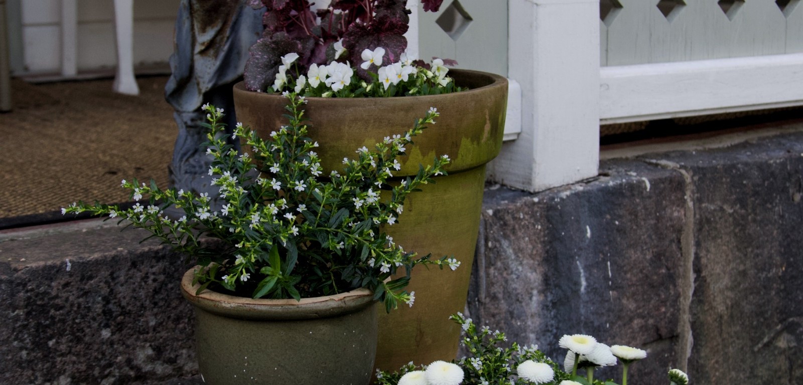 Violerna från förra året hade frösått sig, så det var bara att ställa fram krukan och komplettera med en alunrot. När säsongen är över ska jag samla ihop alla alunrötterna och sätta dem i rabatten framför hortensiorna där vi redan har ett helt hav av dessa.