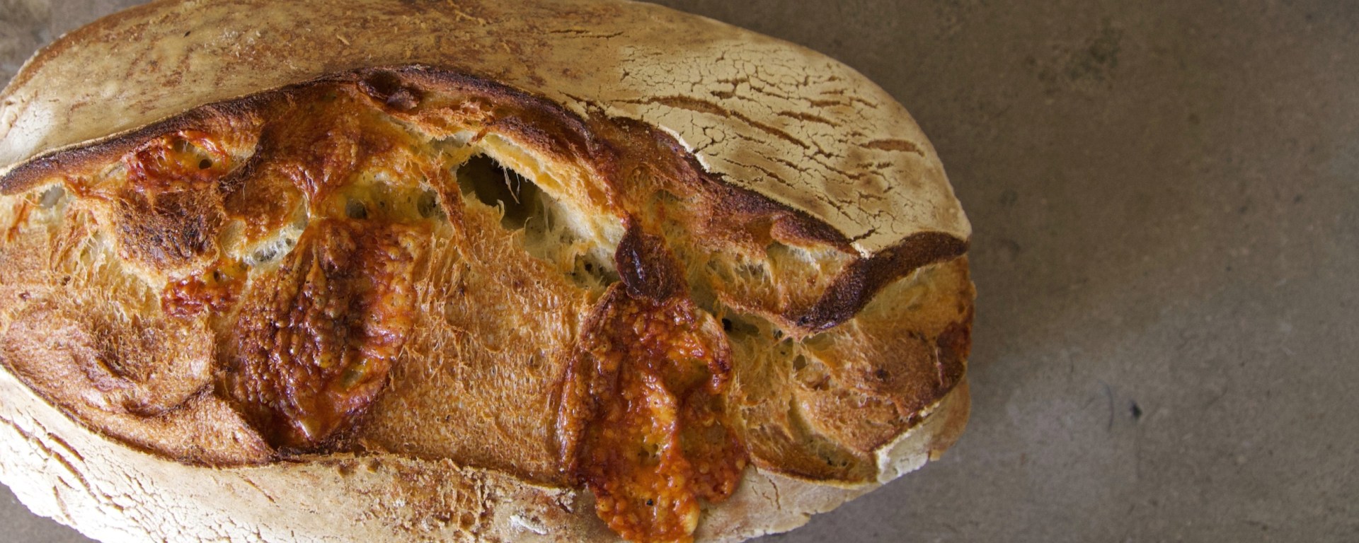 Jag tycker att bröd med ost gör sig bäst när de får självspricka, det kan vara svårt att få till snygga snitt när det är ostkuber i vägen. Därför formade jag till avlånga bröd, med en djup skarv i mitten som fick jäsa med skarven neråt på mjölat träplank över natten.