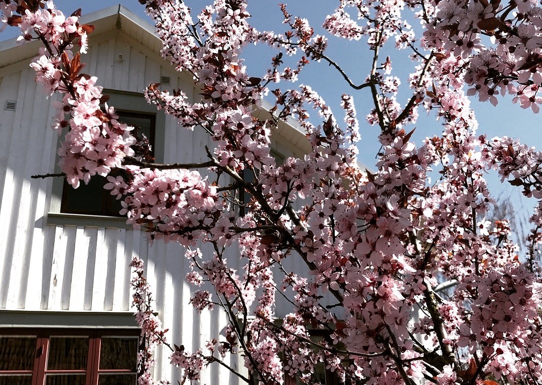 Det går fort i trädgården just nu. Värmen förra veckan gjorde att allting bara exploderade, och jag hann knappt fotografera förrän det var över. Här fångade jag i alla fall vårt fina prydnadskörsbär Prunus cerasifera på innergården i sin finaste blom. Följ med på ett varv runt huset!
