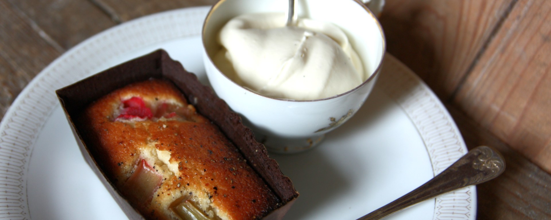 Spritsa ut smeten i muffinsformar eller liknande. Fyll först botten av formen, lägg dit några bitar rabarber, och sedan smet tills det fyller 3/4 av formen. Strö över lite veteströ som dekoration. Baka i 225°C i 13-16 minuter, tills det är fin färg på ytan. Den går också fint att baka i en större form, men på lägre temperatur under längre tid. Prova alltid med en sticka för att se om kakan är klar.