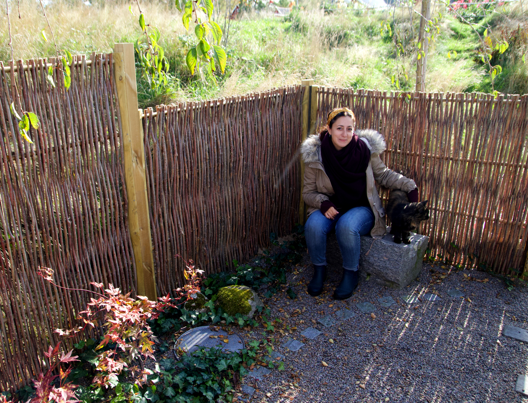 Josefin och katten Bamsen i en avdelning som kallas ensamma rummet, med inspiration från enkelheten i Japanska trädgårdar.