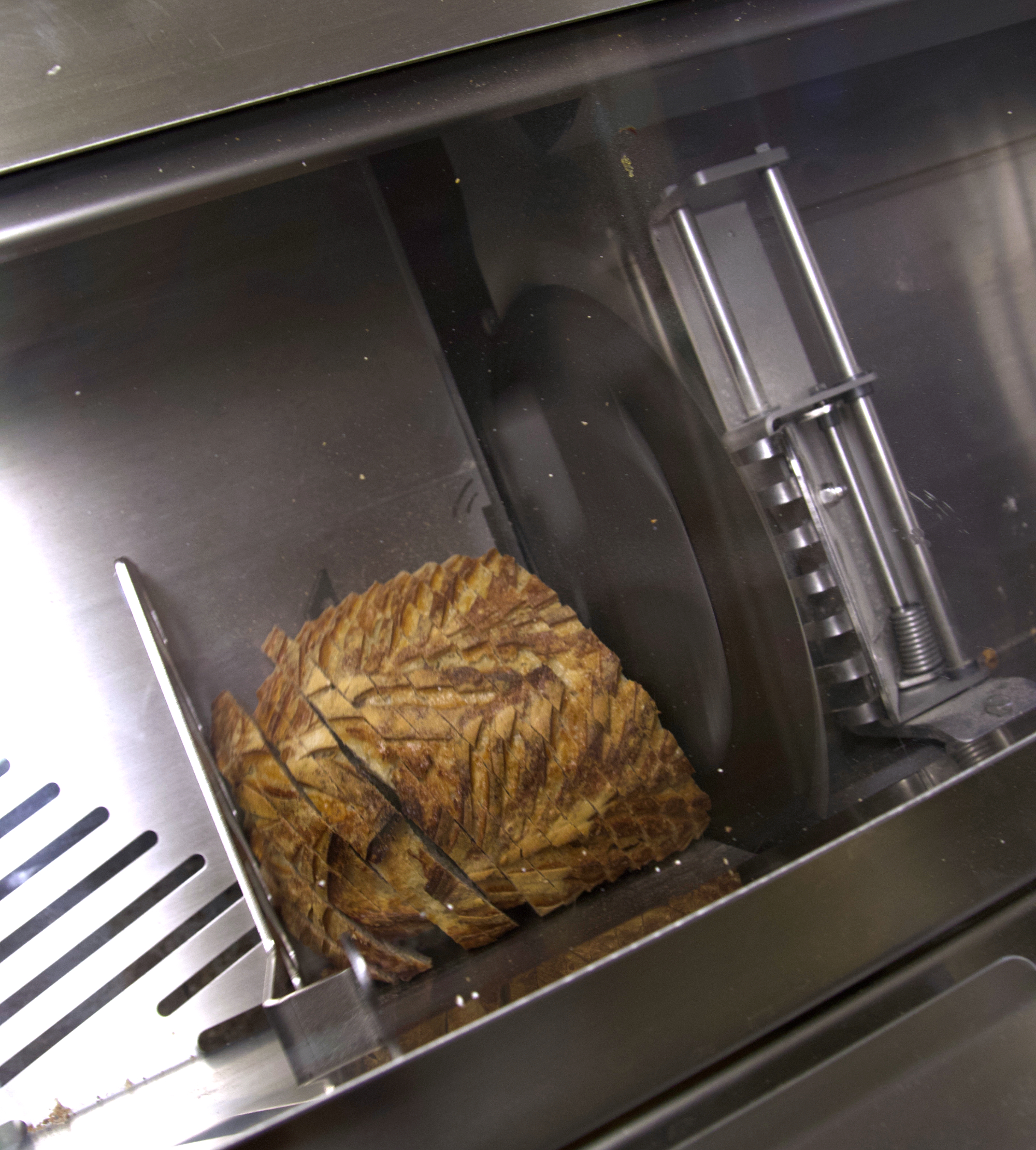 Förra årets investering ströbrödskvarnen gick dock sönder strax före högsäsong, så vi fick blöta ner torkade brödskivor istället. Det gick precis lika bra. Flera av våra bröd innehåller nu runt 5-10% återvunnet material.