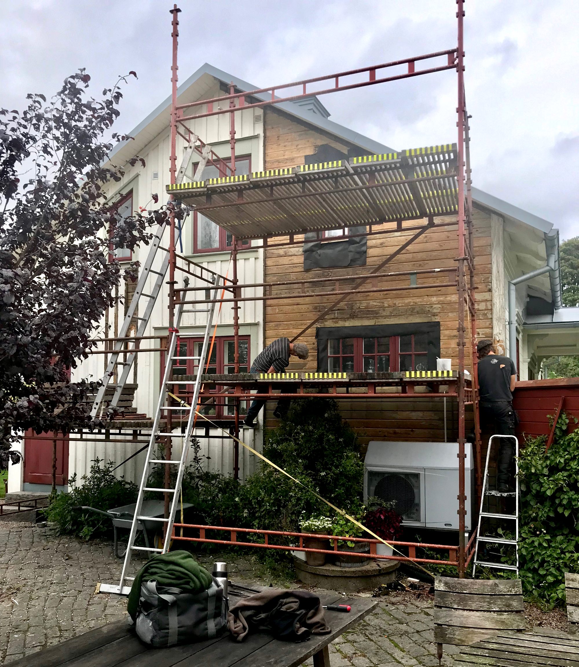 Vi fortsatte byggnadsvårdsprojektet på Solhaga med att ta fram originalfasaden även på sydvästsidan. Det är inte riktigt klart ännu, vi ska måla detaljerna kring den nya dörren bara. Sedan kommer bilder!