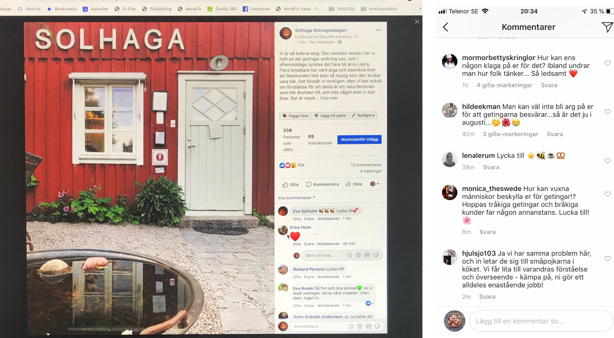 I början av augusti kom getingarna, och med dem kom även kunder som var ungefär lika ilskna och fyllde våra skärmar och telefoner med arga brev. Som tur var fick vi även en massa medhåll av kloka följare. Men jag kände direkt att nej, det här orkar jag inte med. Tidigare år har vi till och med fått ettor i recension på Facebook för att vi inte ”gjort något åt getingarna”. Så vi bestämde oss för att stänga uteserveringen. En del gäster envisades med att fika iallafall, men fick ge upp efter en stund.