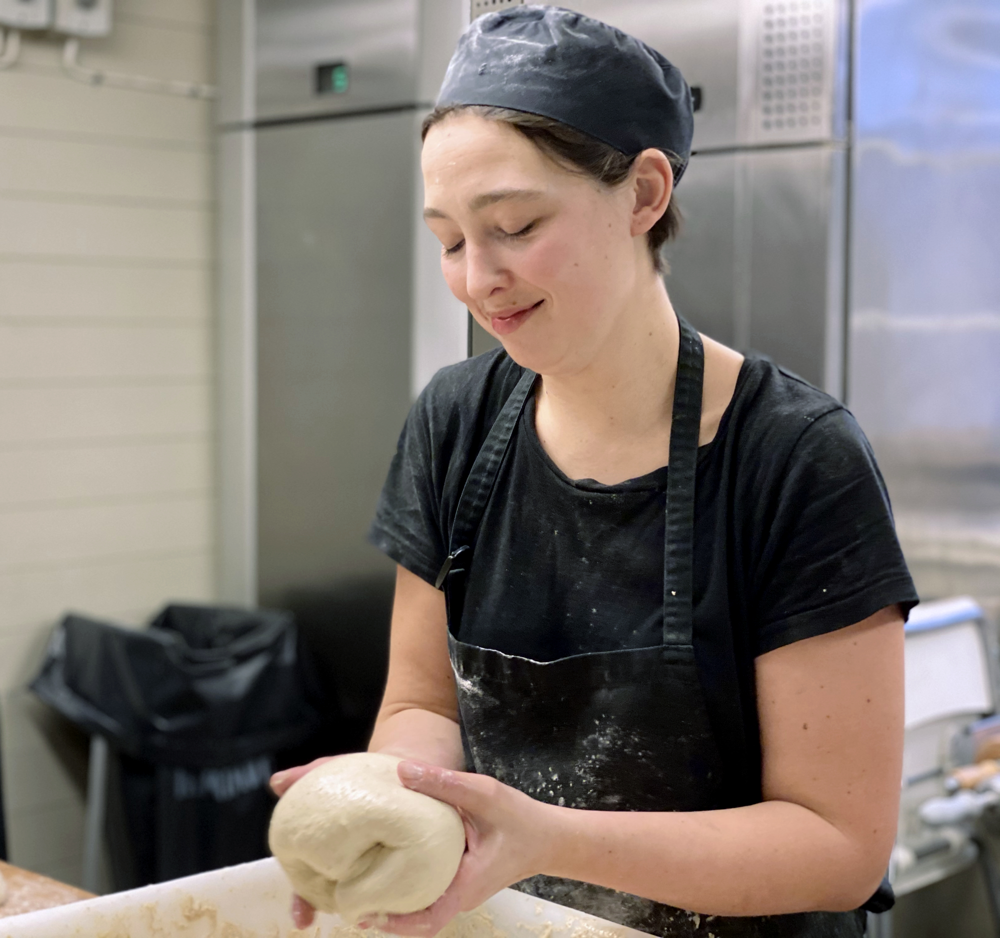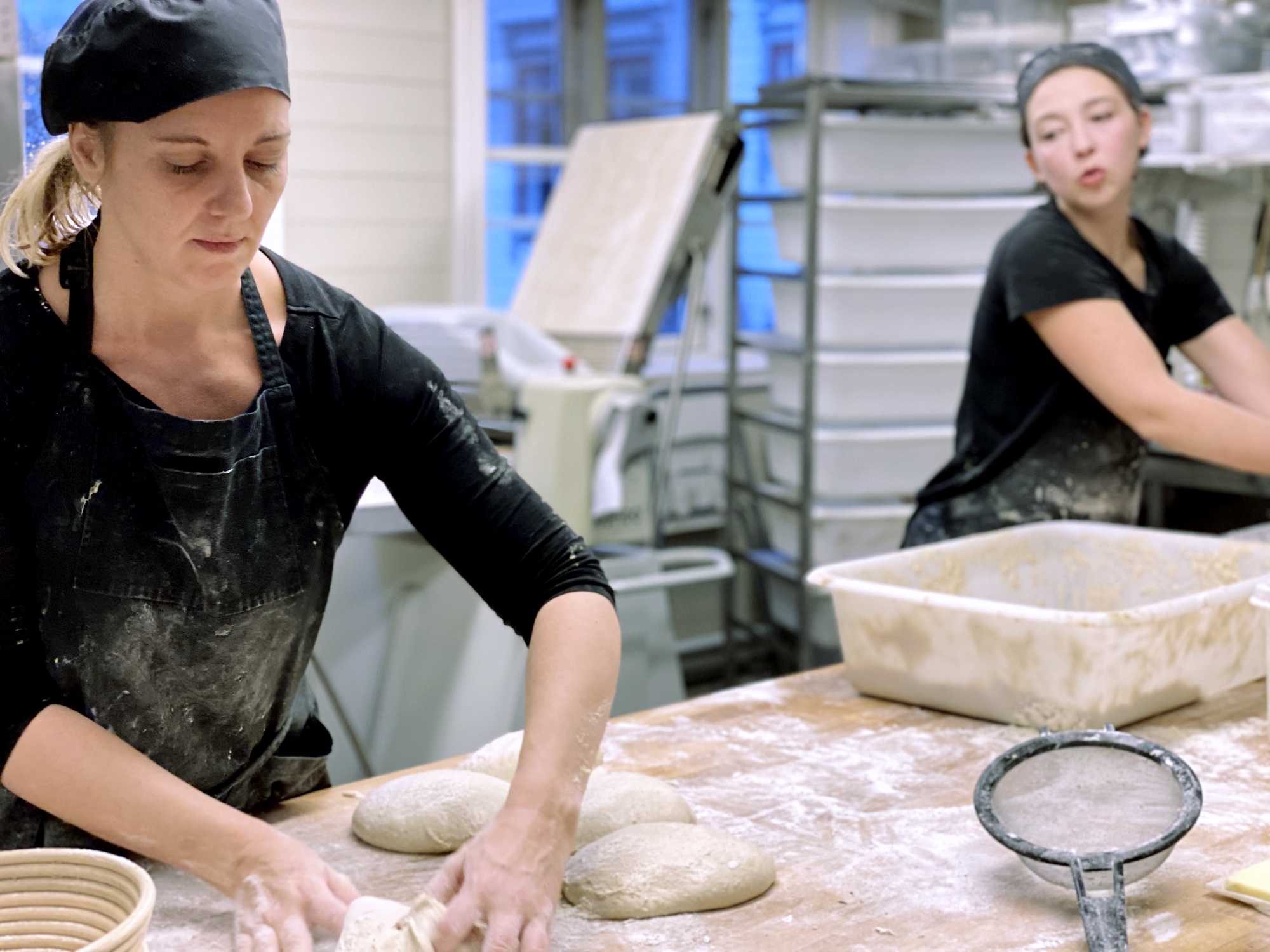 Vi satsade alltså på en väldigt vek deg, vilket kan vara riskabelt på många sätt. Degen jäser fortare och blir svårare att hantera. Å andra sidan kan man bli belönad med ett fantastiskt inkråm i slutändan om man lyckas med processen. Den här degen kändes ändå stabil. Vi gjorde flera vikningar under tre timmar, slog upp den i korgar med duk och satte in i kylen.