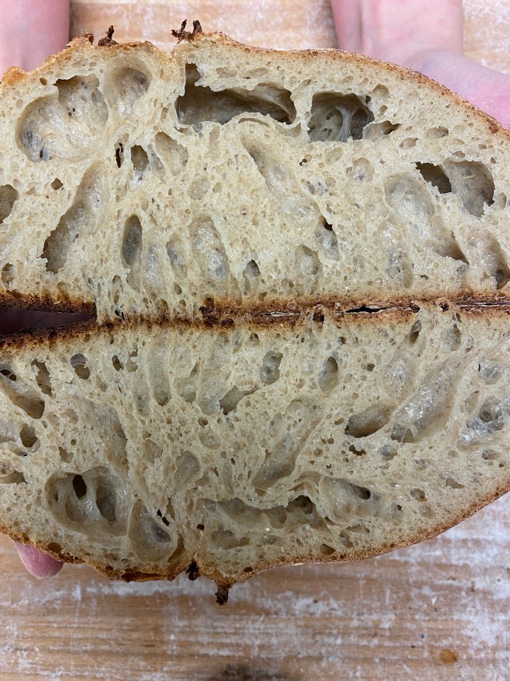 Nästa dag justerade vi ner vattenmängden från 78 till 75 procent, och fick en betydligt mer lätthanterlig deg. Inkråmet har jag tyvärr ingen bild på, för bröden sålde slut innan jag hann knipa ett exemplar.
