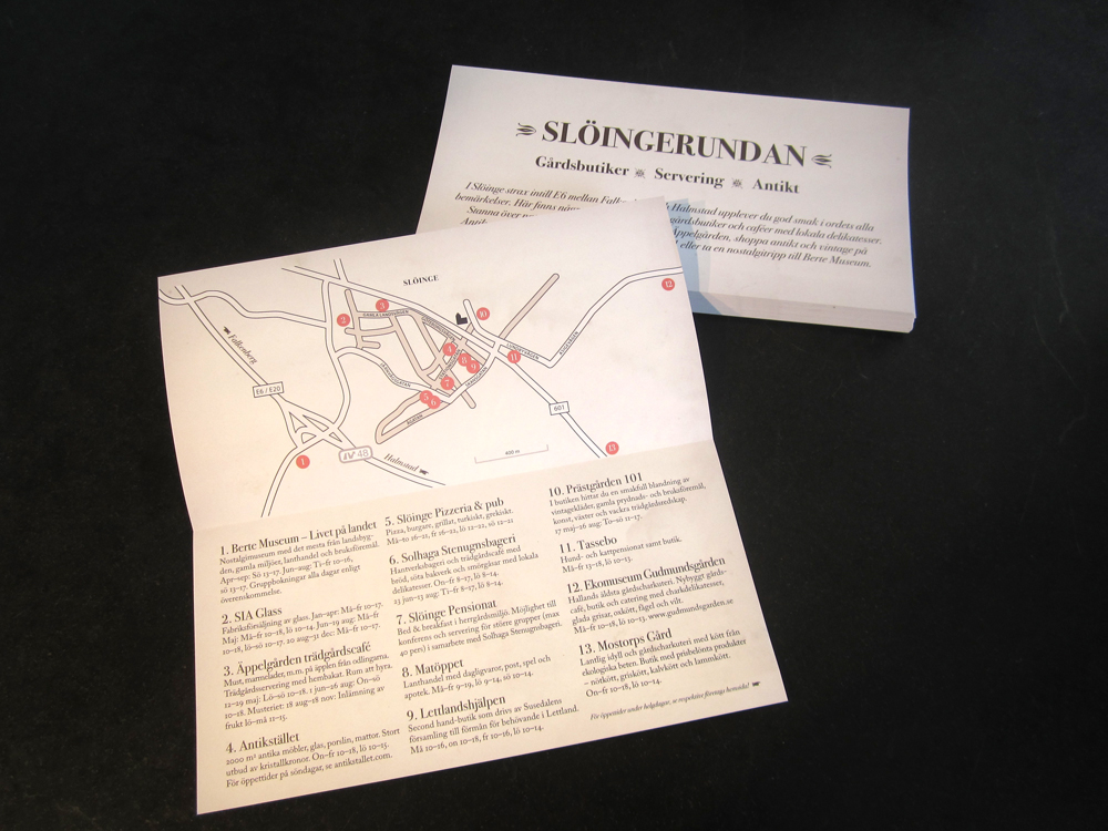 Vi märkte att många kunder pratade om att de alltid åkte en runda i Slöinge. Ante och jag fick idén om att samla alla byns företag på en karta för att visa på allt som fanns, och det blev början på en förflyttning av varumärket Slöinge. Från en håla vid världens ände till en by där det bubblar av liv och entreprenörsanda.
