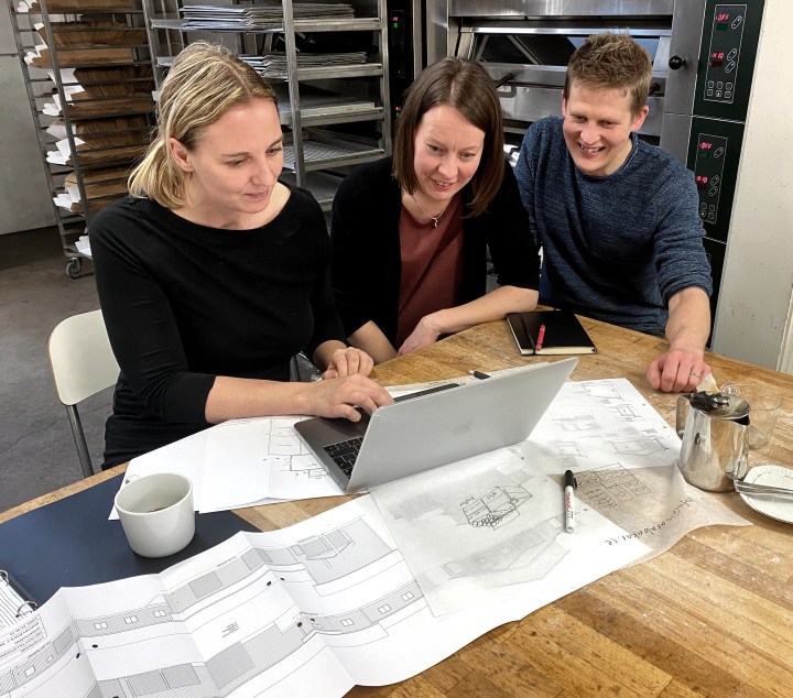 Det här året fick jag också en ny roll som rådgivare inom bageri för Eldrimner – nationellt resurscentrum för mathantverk. Det betyder att personer som driver eller ska starta bageri kan få min hjälp med allt från budget till utrustning och planritningar. Det har gett mig så mycket att få vara del av andras processer och dela det jag har lärt mig. Här sitter jag med Camilla och Markus Smeds, som följt min resa på bloggen i alla år. De reste hit ända från Finland, och just nu är de i full gång med att bygga bageri med vedugn på Jeriko Gård utanför Jakobstad.