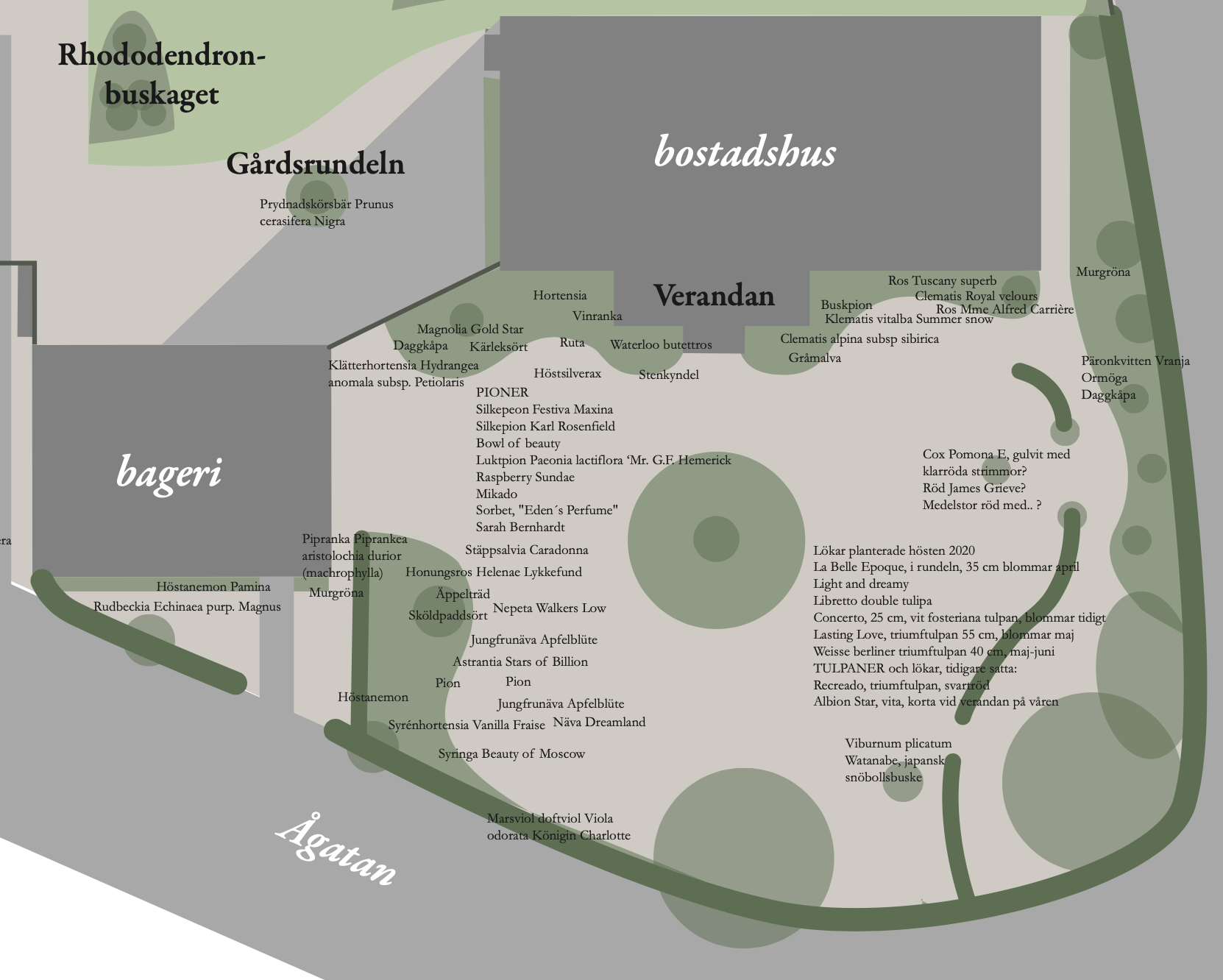 Vi får många frågor från gästerna om vilka växter vi har i rabatterna, så nu skissar jag på en trädgårdskarta som man ska kunna låna. Som tur är har jag varit noga med att dokumentera allt under åren och har namn på det mesta, jag återkommer med fler bilder nu under våren när vi ser vad som tittar upp!