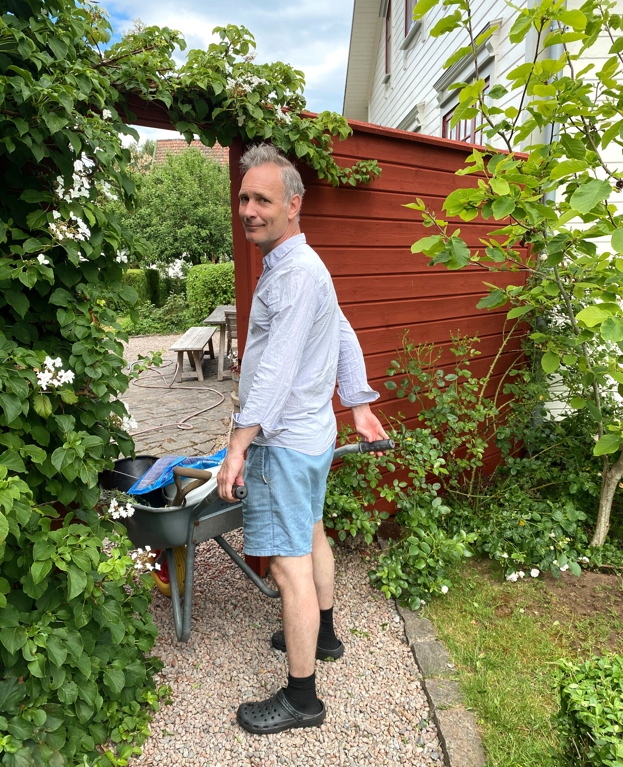 Det finns andra nackdelar med gräs. Här ser vi Ante en typisk sommarkväll efter stängning, när vi är ute och sköter om trädgården. Flyttar alla möblerna, klipper gräs och tar hand om allsköns växtlighet. När vi egentligen borde vila upp oss inför nästa dag.