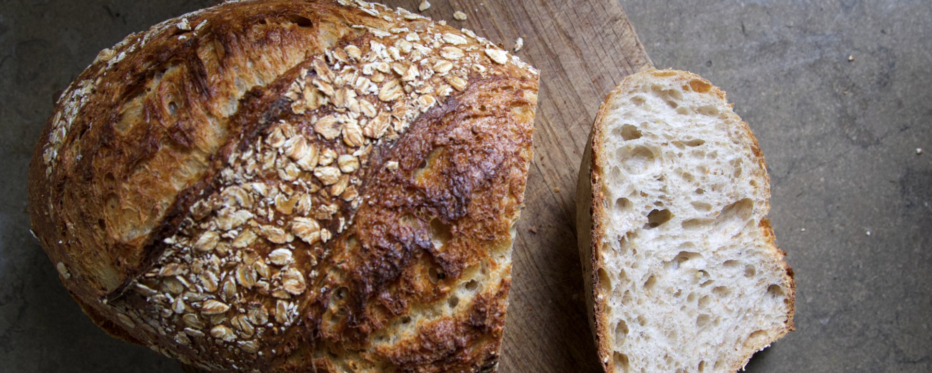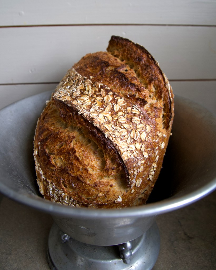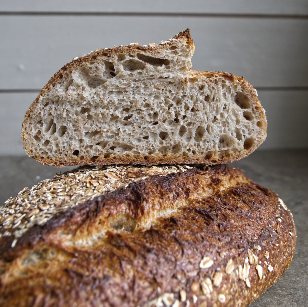 Låt degen vila i en inoljad plastlåda i cirka 2 timmar, vik ihop en gång under tiden. Häll ut degen på mjölat bakbord och dela i två bitar. Forma till ovala bröd. Spraya den släta sidan med vatten, och strö lite havregryn över. Lägg med havregrynen neråt på bricka som är lite lätt mjölad med vetemjöl.