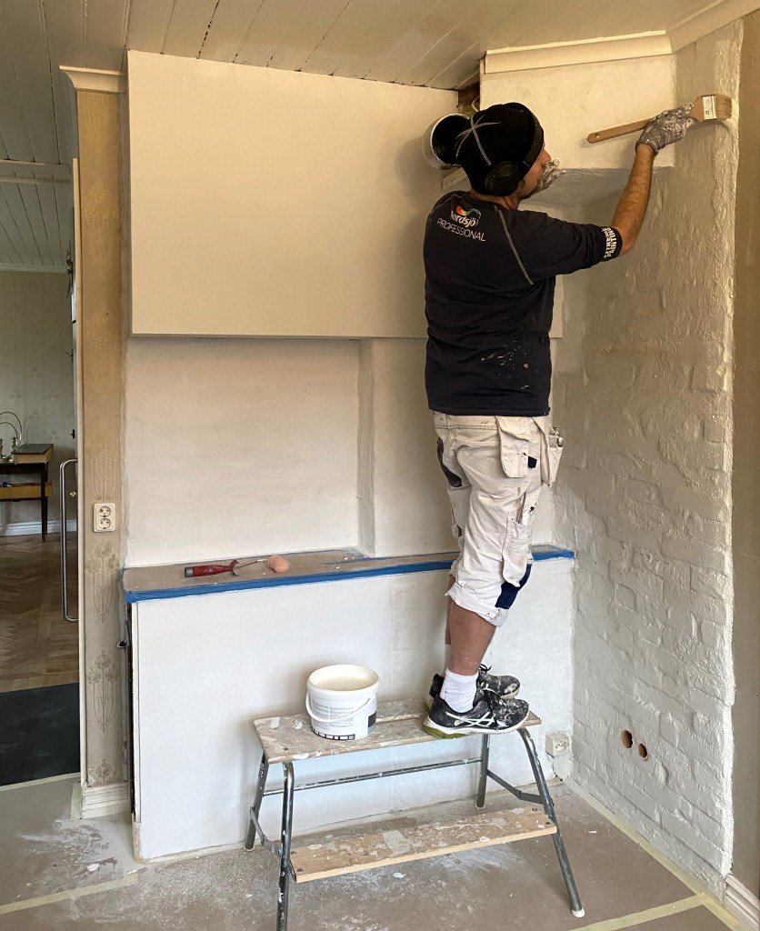 Köksrenoveringen ja. Veckan slutade med tema ”fel färg”, det gick inte alls som jag hade tänkt mig. När målare Jörgen skulle fullända det murade partiet där spis och ugn ska stå, tyckte han att färgen kanske var lite väl gul. Citrongul liksom, så vi bestämde oss för att inte ens prova att måla upp en större yta. Han fick åka och byta burk, så det löste sig ganska bra.