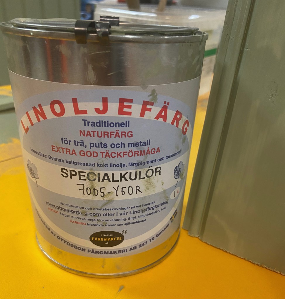 Så plingade det till i telefonen, en bild från snickarna som glatt berättade att disken nu var färdigmålad! Jag konstaterade med fasa att färgen varken var mörkbrun eller beige, utan något slags piggelin-grön. Jag bad om en bild på burkens NCS-kod och förstod plötsligt att jag ägnat hela eftermiddagen åt att leta efter en burk som aldrig ens hade existerat. Den här färgen borde alltså ha varit mörkbrun enligt färgkoden, så något måste ha hänt på färgmakeriet. Vilken rörig historia detta blev…