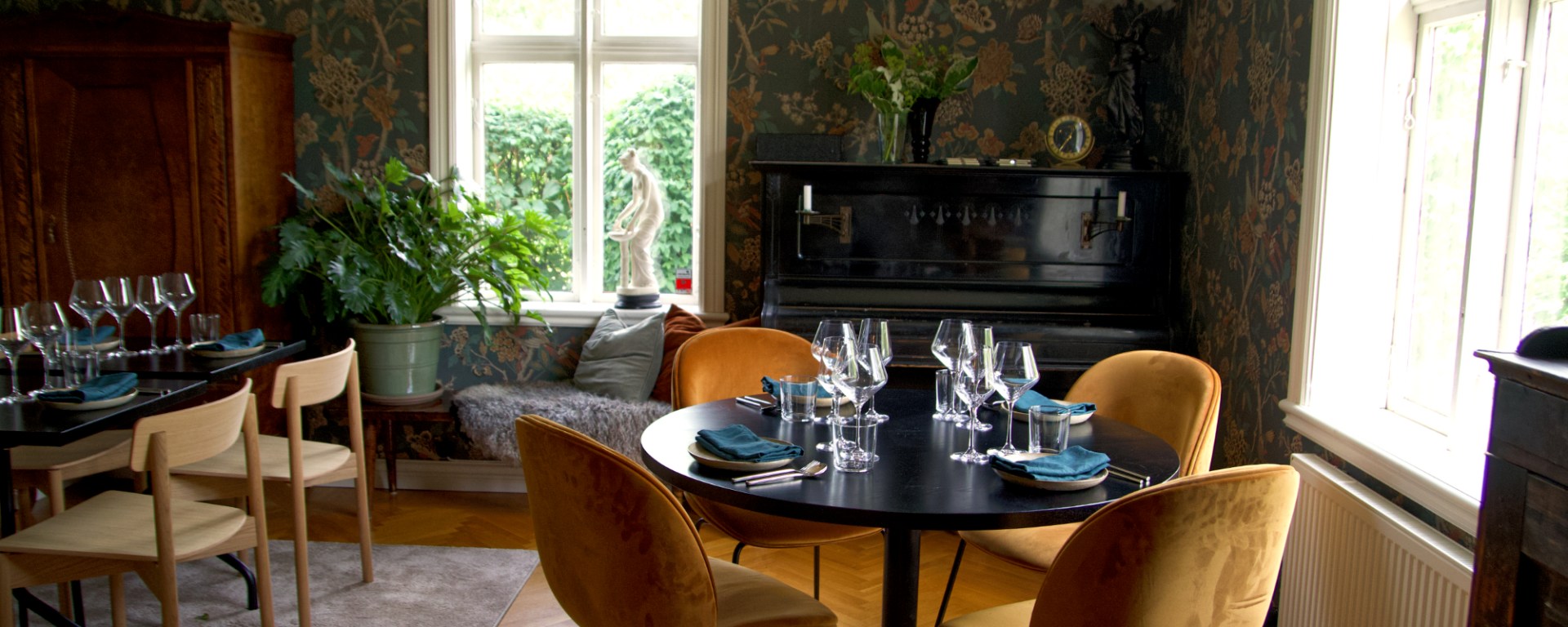 Vi ville att salongerna skulle ha ett modernare uttryck, och inte bli för mycket som man tänker sig en gammaldags salong. Loppismöbler i all ära, men de håller kanske inte riktigt för trycket. Vi fastnade för den här stolen, Cross Chair i ljus oljad ek från Takt CPH. Och en fin grönblå linneservett från Linneverket som passade fint till alla tapeter.