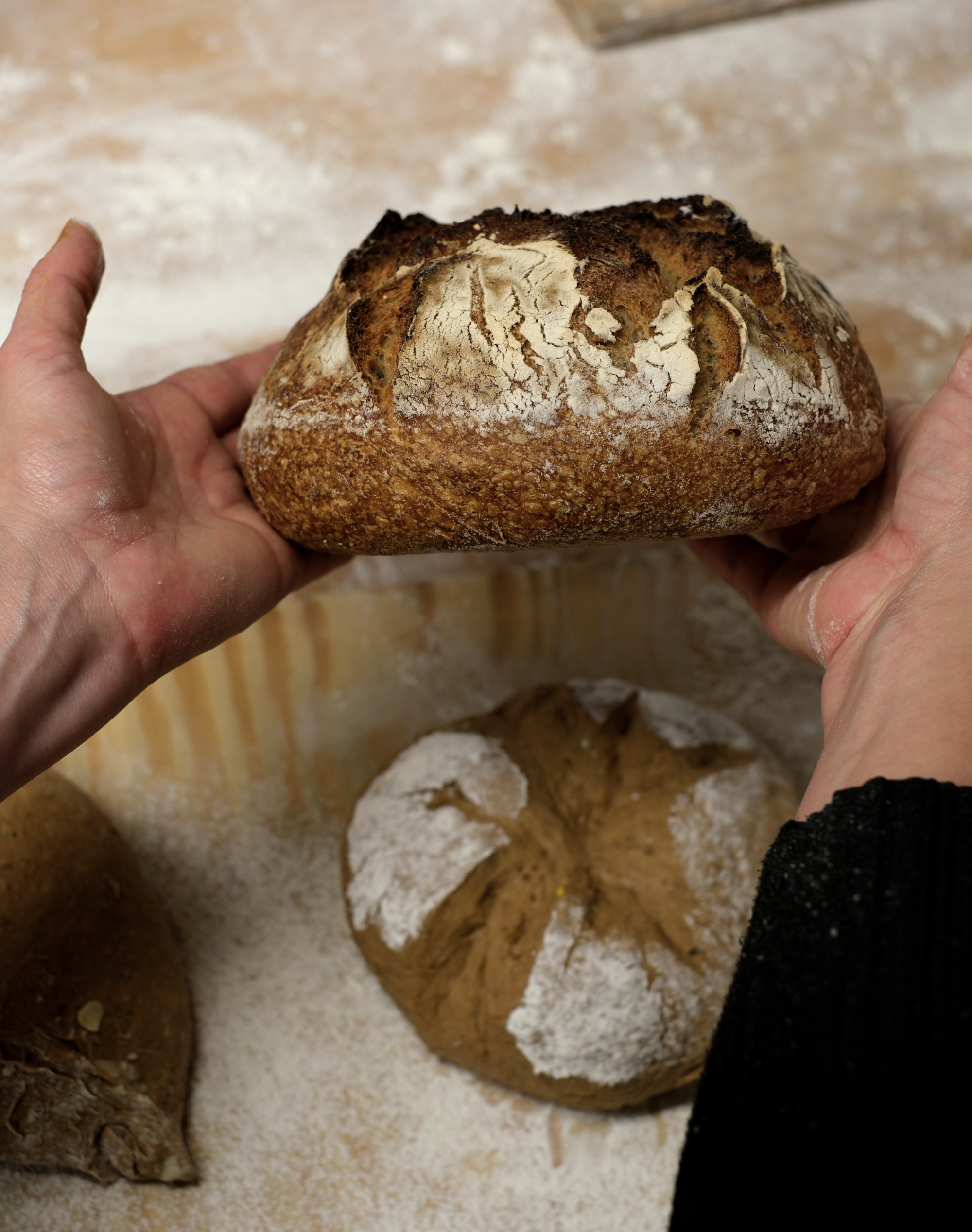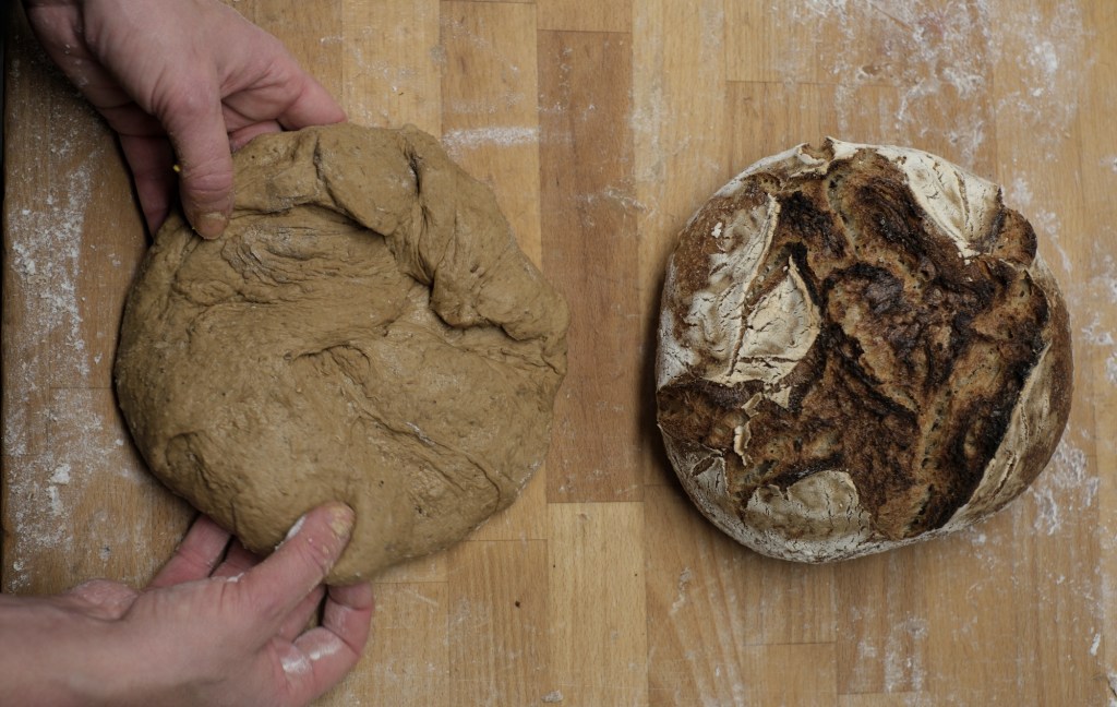 Notera också hur brödets undersida får en fin rundning och ett lyft uppåt eftersom vi vänt på den. Hade vi bakat av ett bröd precis som det legat och jäst kommer undersidan att bli betydligt plattare.
