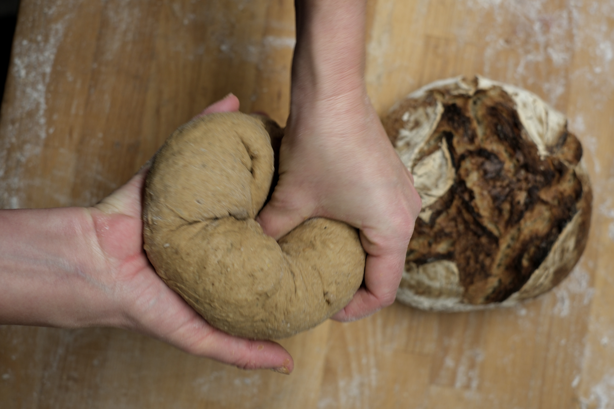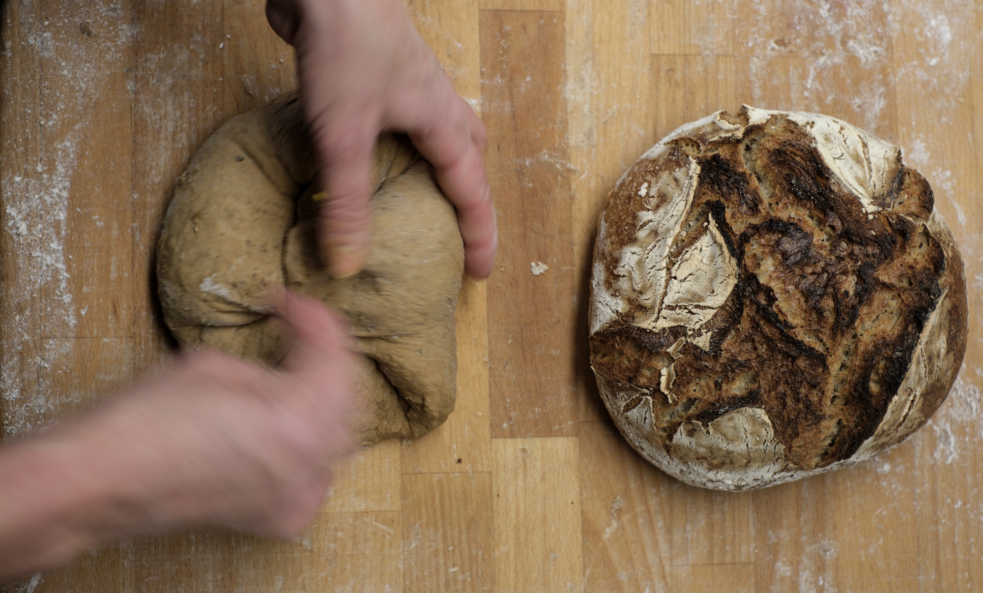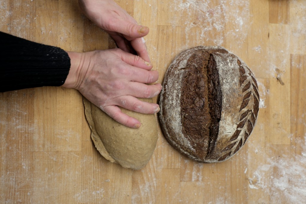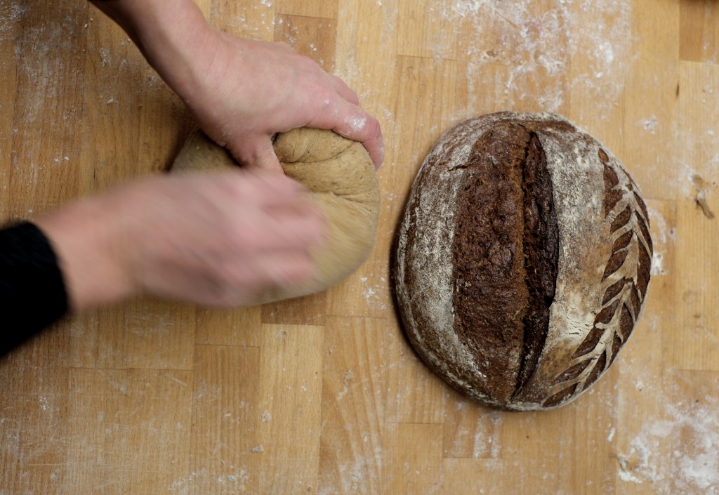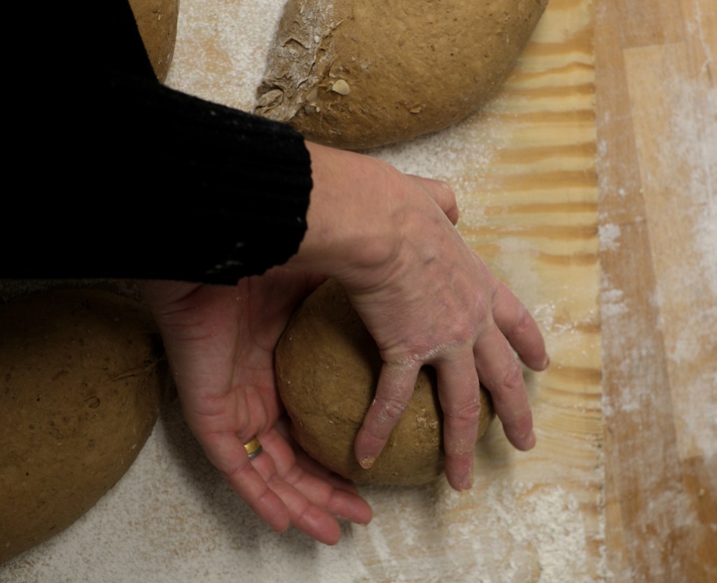 Vi börjar med att rundriva, att vika kanterna in mot mitten och därmed spänna upp degen så att brödet lyfter bättre i ugnen.