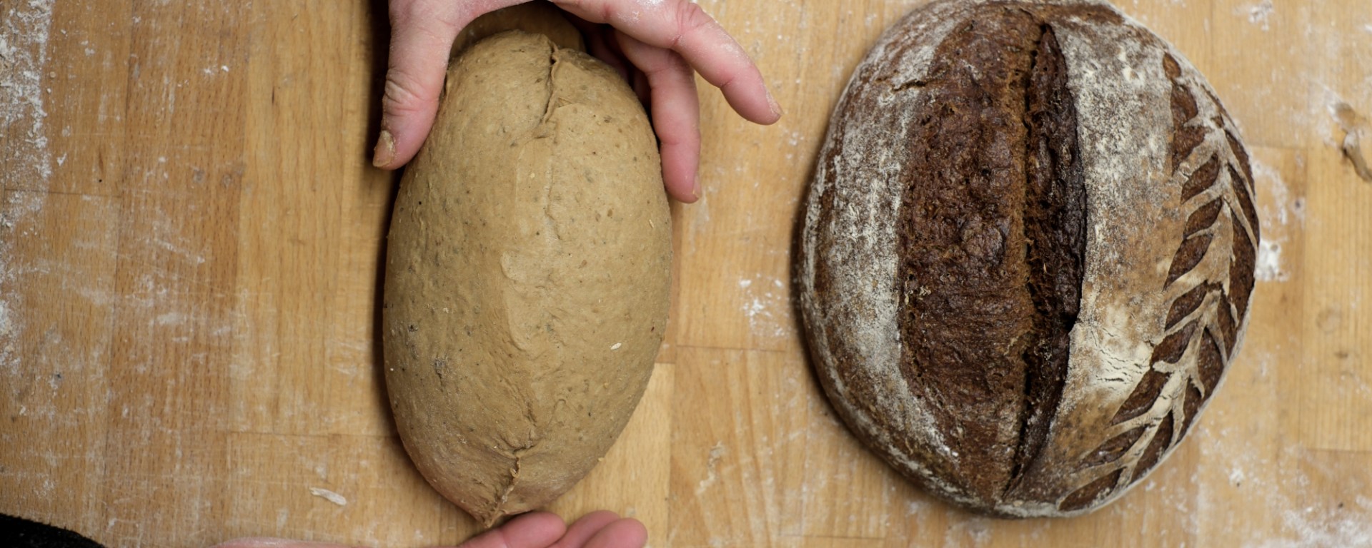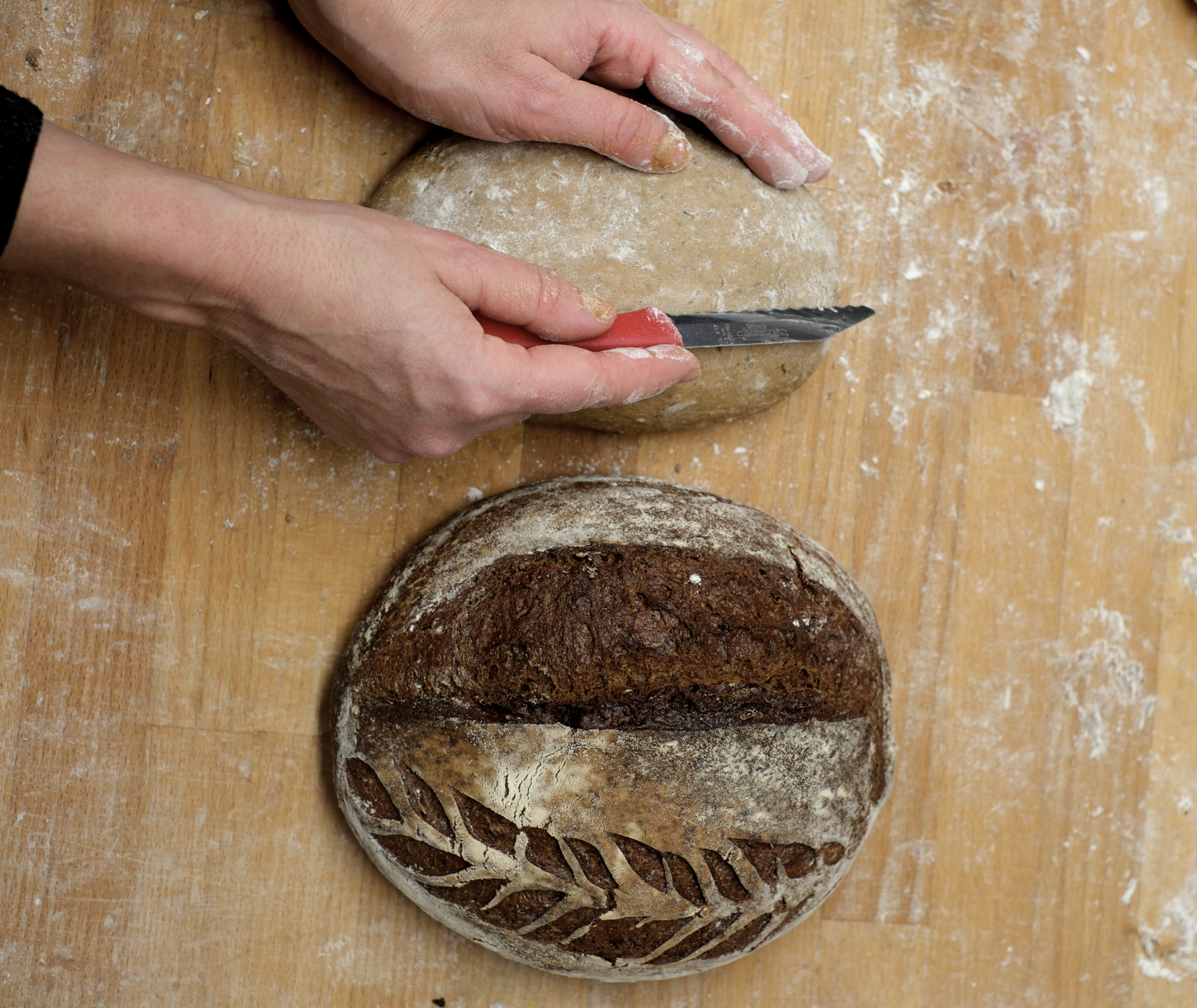 När brödet jäst färdigt vänder vi upp det med släta sidan uppåt, mjölar lite lätt på ytan och snittar. Det djupa snittet gör vi med en sågtandad snittkniv, det är detta som gör att brödet kan växa och få volym. Till det dekorativa axet på sidan använder vi ett snittblad utan tänder.