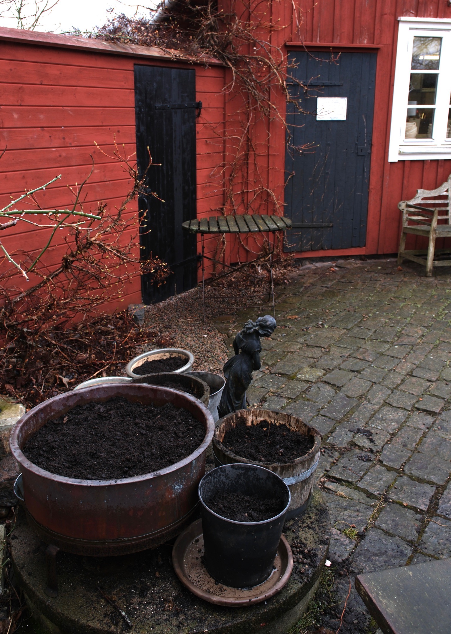Ännu mera plats för sommarblommor. På brunnslocket är det sol hela dagen, därför fyller jag krukorna med riktigt bra urnjord som ska hålla fukten bättre.