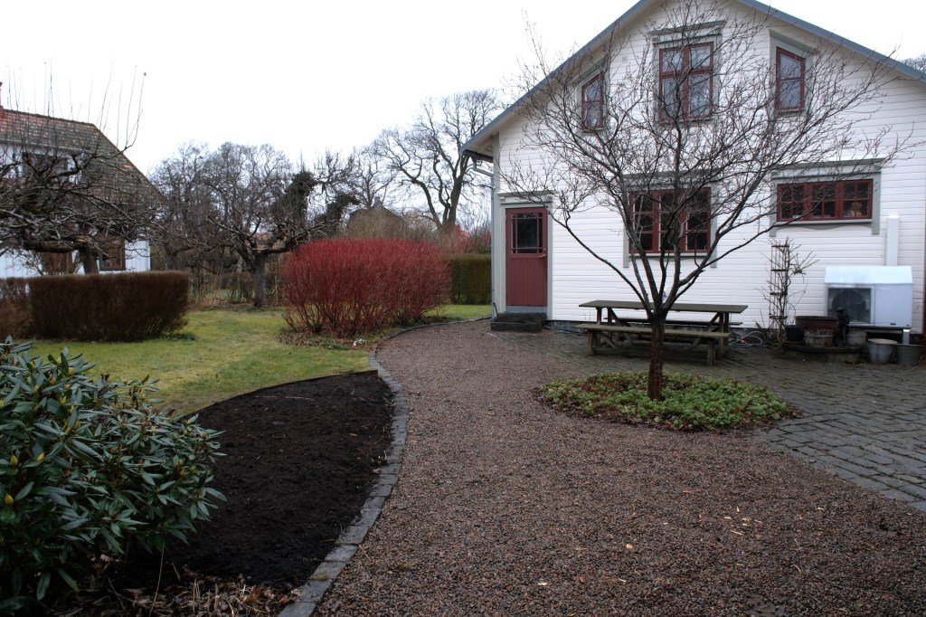 Även i det bortersta hörnet av trädgården finns en rabatt med mycket nävor och smultron, så behändigt om det skulle bli ett överflöd av plantor. Är otroligt nöjd med denna flexibliltet.