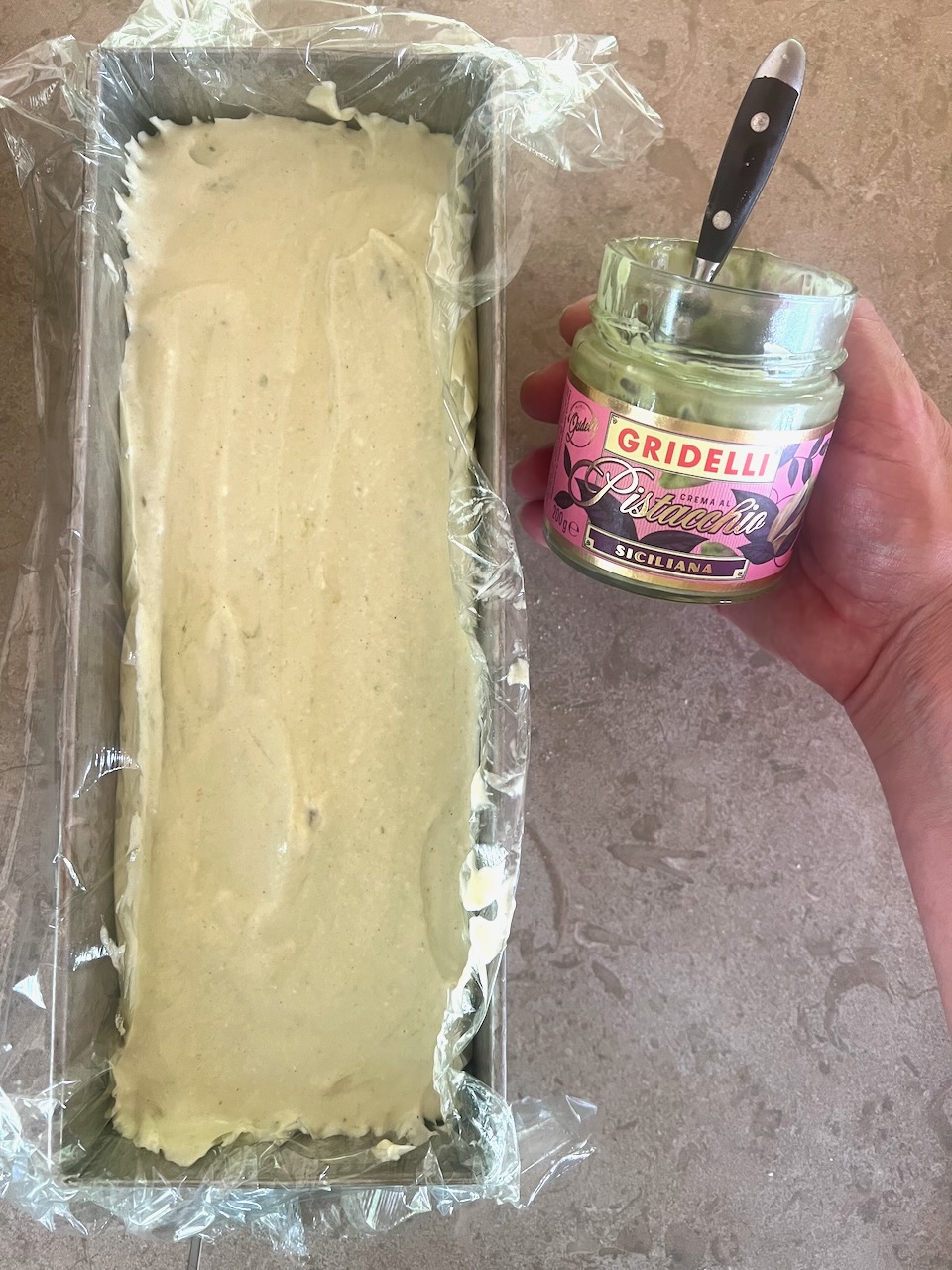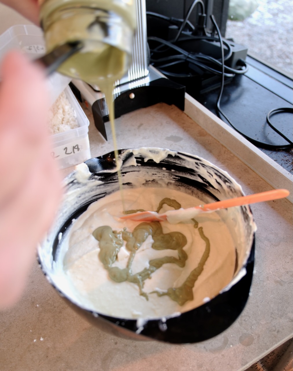 Nu ska den andra hälften av pistagekrämen ner i smeten och bilda swirls, det kan bli lättare om du värmer den lite försiktigt i mikron först. Jag körde den på halv effekt i 30 sekunder.