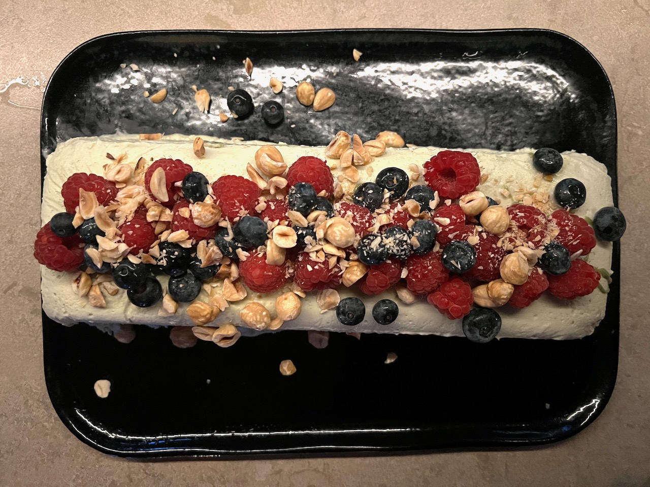 Just denna kväll serverades den i avlångt format med bär och hasselnötter på. Kan vara lagom att ta fram ur frysen en halvtimme innan servering.
