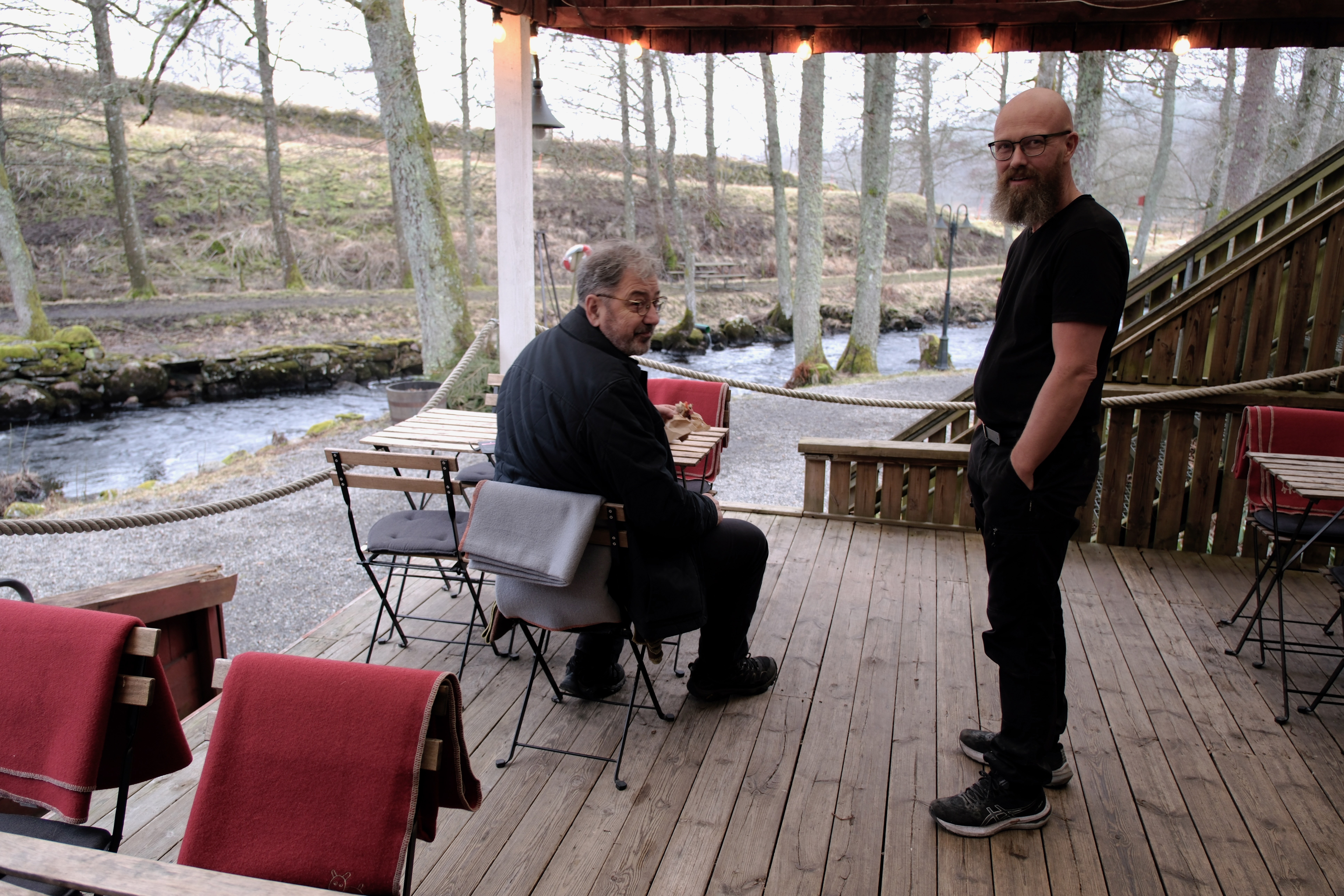 Vi får en liten rundtur i lokalerna, Oskar passar på att växla några ord med en stammis som tar årets första utefika vid Säveån på baksidan.