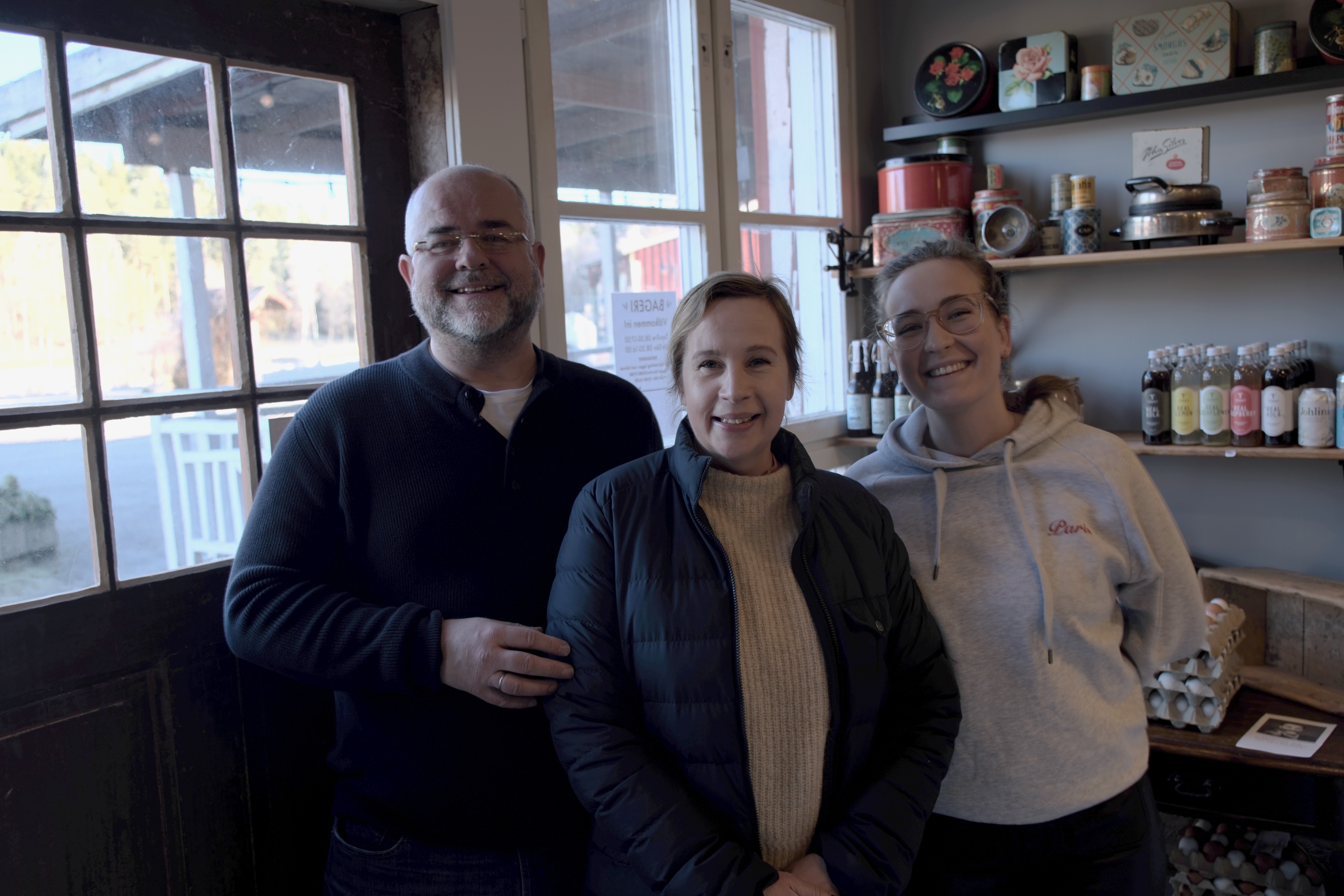 Jag ska bara ta en bild utanför bageriet, och precis då tittar Malin ut och hälsar oss välkomna.
