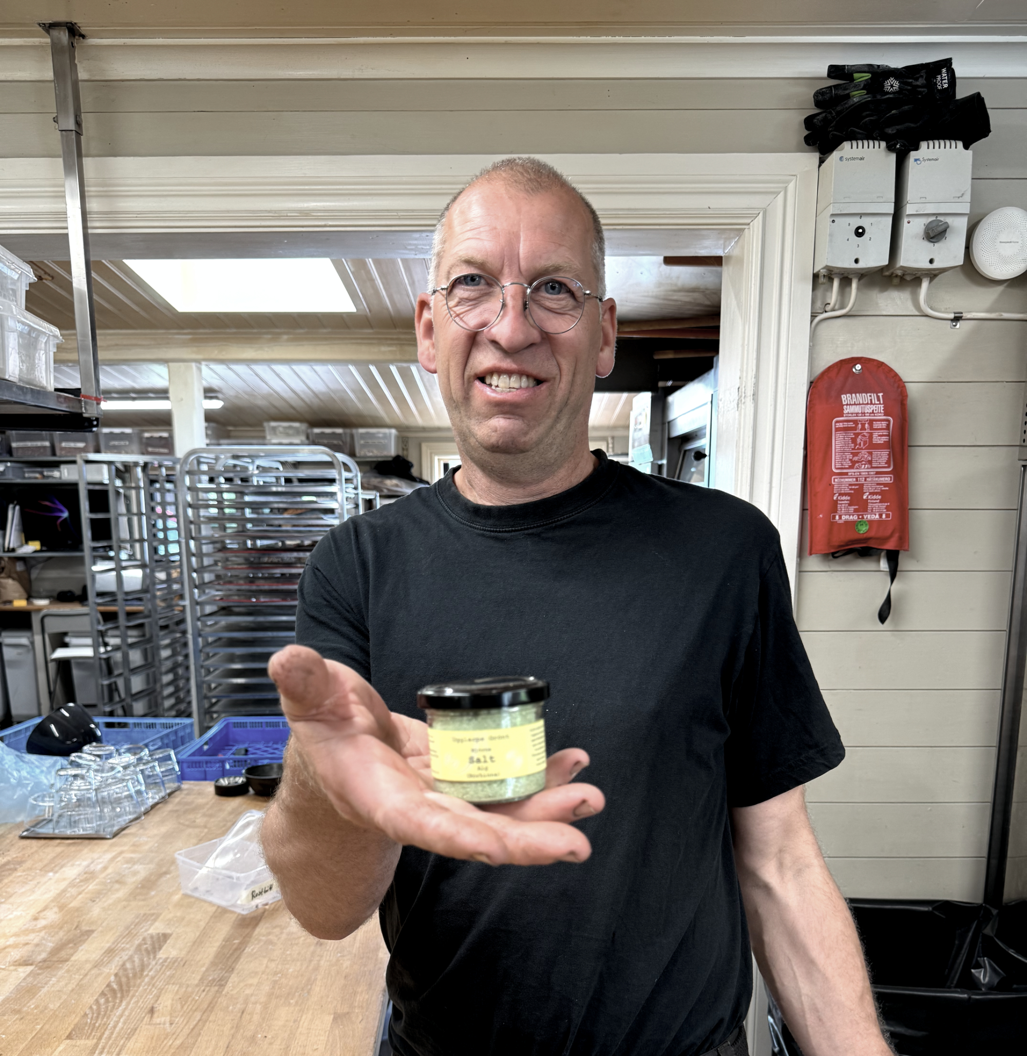 Björn som jobbar som kock på Ugglarps Grönt, maler algen ihop med havssalt och låter det sedan torka. Resultatet blir ett grönt salt som smakar hav.