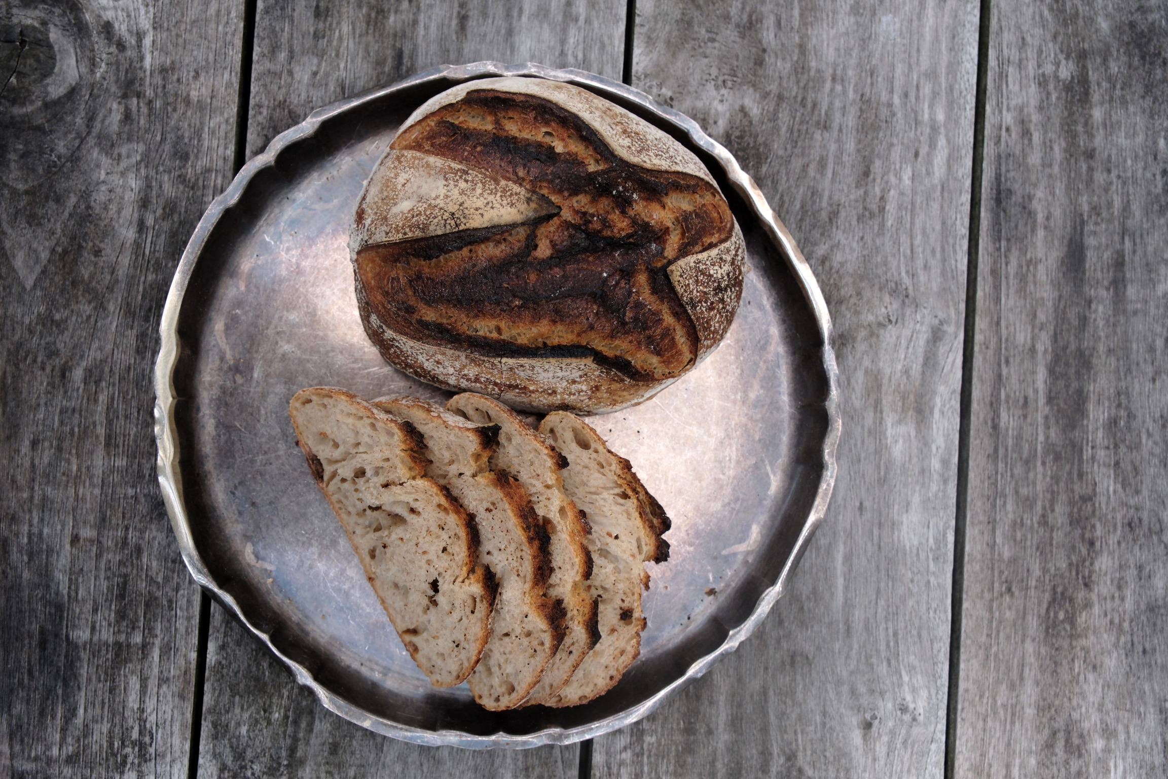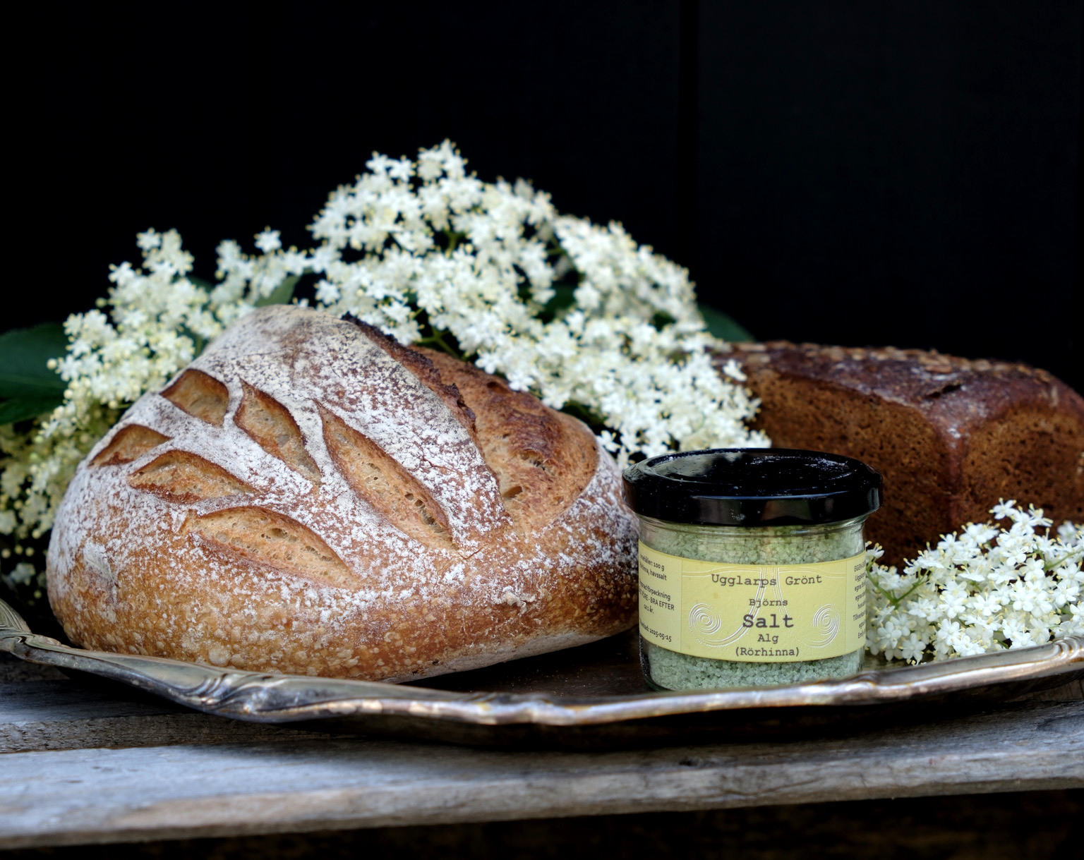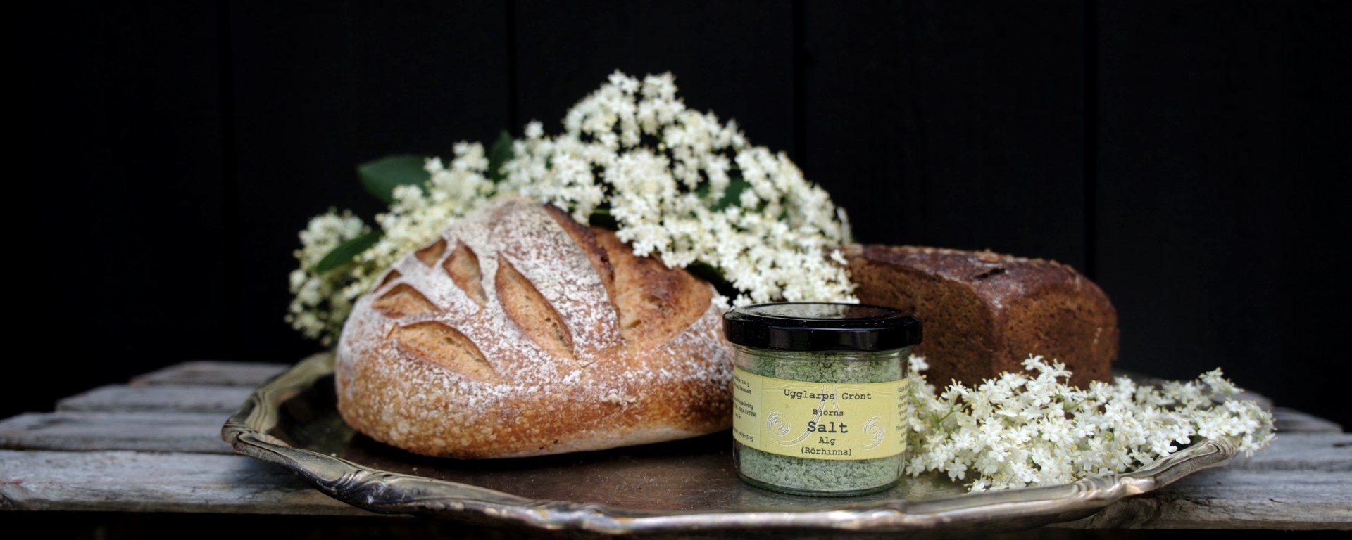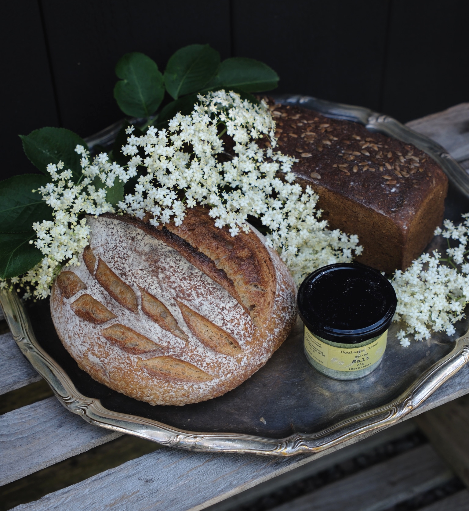Med fullkornslevainen som bas, algsaltet som krydda och cheddar som pricken över i, blir detta ett midsommarbröd med behaglig sälta som gör sig fint att äta nästan precis som det är, eller med bara smör. Här på brickan har det fått sällskap av sillabrödet, numera en klassiker till alla högtider på Solhaga.