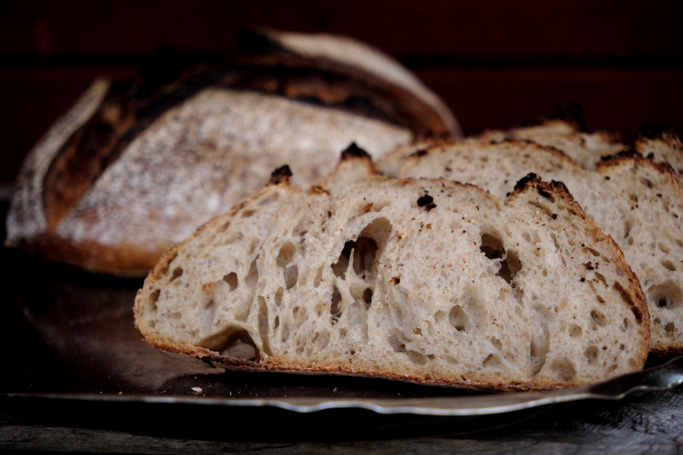 Vi spånade lite på hur vi skulle kunna göra ett liknande bröd i degblandaren, med vårt vanliga vita levain som utgångspunkt. Resultatet blev fullskornslevain, som har ungefär samma sammansättning som Slöingebrödet men utan den handknådade processen med många vikningar. En väldigt fin kompromiss visade det sig, och vi är lättade att varje dag kunna lägga ett lite grövre surdegsbröd i hyllan. Tanken är att innehållet också kommer att variera lite efter råvaror och humör.