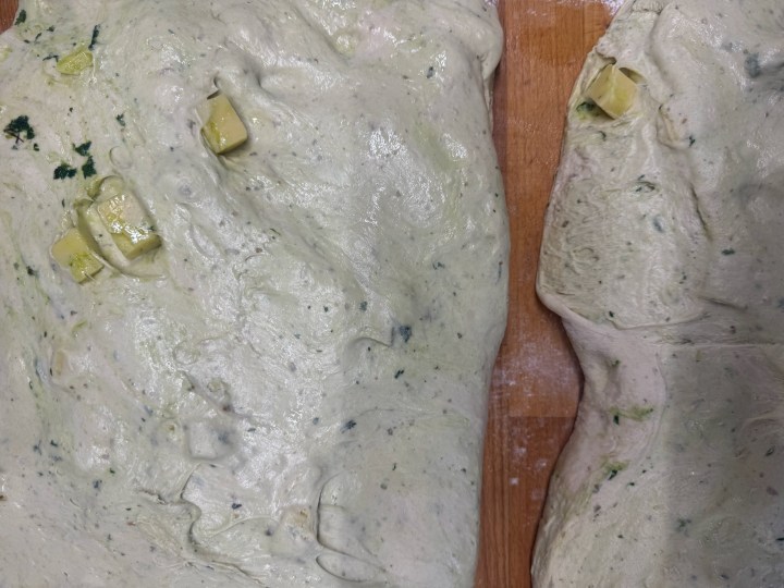 Lägg degen i en lätt inoljad plastlåda. Låt den vila i cirka 30 minuter, vik sedan in mot mitten, en gång från varje håll. Låt vila i ytterligare 30 minuter. Se så fin och grön den blir.