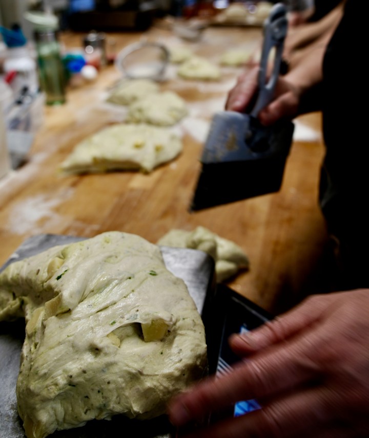 Blanda fördegen med vetemjöl, vatten, surdeg, nässel- och gräslöksolja samt jäst i en degblandare på låg hastighet i cirka 10 minuter, eller för hand dubbelt så länge. Tillsätt saltet och kör på högre hastighet i 3–5 minuter. Allra sist blandar du ner cheddar på låg hastighet tills det precis gått ihop.